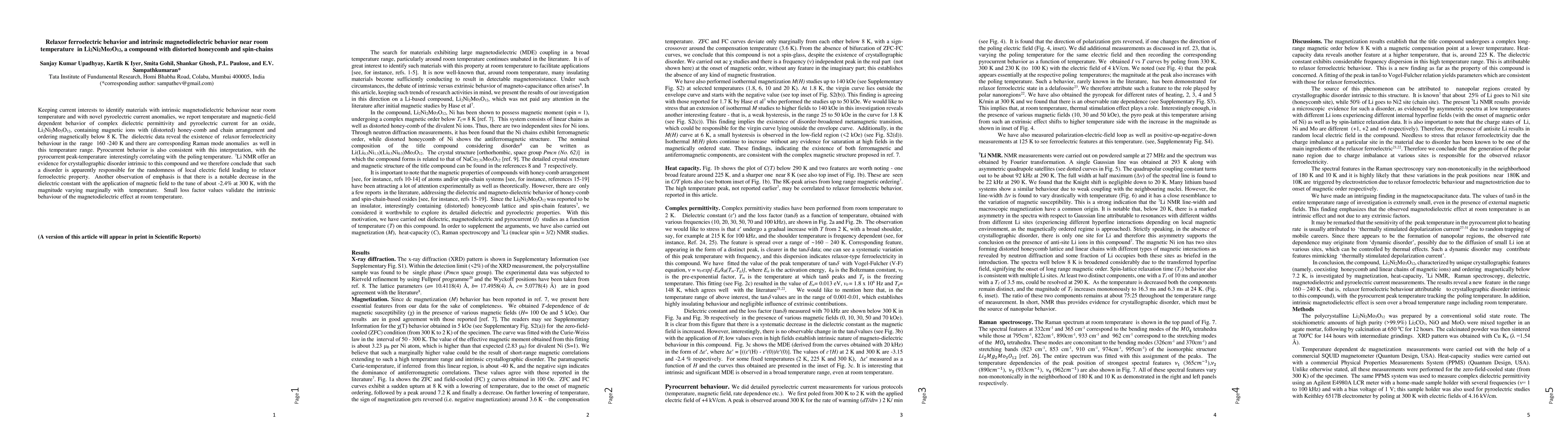 Keeping current interests to identify materials with intrinsic magnetodielectric behavior near room temperature and with novel pyroelectric current anomalies, we report temperature and magnetic-field dependent behavior of complex dielectric permittivity and pyroelectric current for an oxide, Li2Ni2Mo3O12, containing magnetic ions with (distorted) honey-comb and chain arrangement and ordering magnetically below 8 K. The dielectric data reveal the existence of relaxor ferroelectricity behavior in the range 160-240 K and there are corresponding Raman mode anomalies as well in that temperature range. Pyrocurrent behavior is also consistent with this interpretation, with the pyrocurrent peak-temperature interestingly correlating with the poling temperature. 7Li NMR offer an evidence for crystallographic disorder intrinsic to this compound and we therefore conclude that such a disorder is apparently responsible for the randomness of local electric field leading to relaxor ferroelectric property. Another observation of emphasis is that there is a notable decrease in the dielectric constant with the application of magnetic field to the tune of about -2.4% at 300 K, with the magnitude varying mariginally with temperature. Small loss factor values validate intrinsic behavior of the magnetodielectric effect at room temperature.