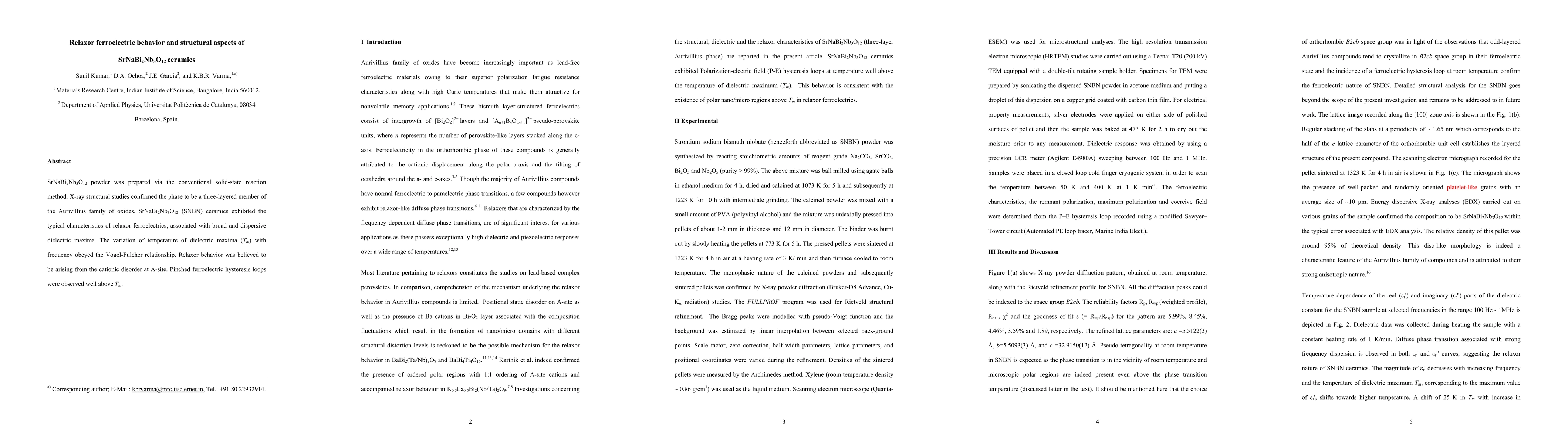 SrNaBi2Nb3O12 powder was prepared via the conventional solid-state reaction method. X-ray structural studies confirmed the phase to be a three-layered member of the Aurivillius family of oxides. SrNaBi2Nb3O12 (SNBN) ceramics exhibited the typical characteristics of relaxor ferroelectrics, associated with broad and dispersive dielectric maxima. The variation of temperature of dielectric maxima (Tm) with frequency obeyed the Vogel-Fulcher relationship. Relaxor behavior was believed to be arising from the cationic disorder at A-site. Pinched ferroelectric hysteresis loops were observed well above Tm.