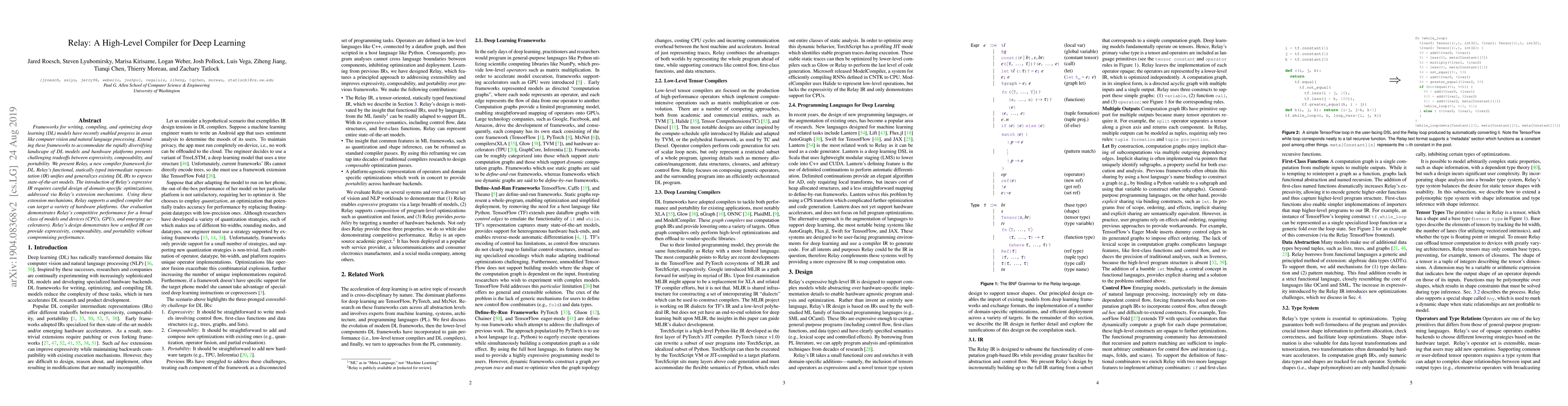 Relay is a high-level compiler framework for deep learning that uses a unified, functional, statically typed intermediate representation to express diverse models. It supports optimizations and extensions to target various hardware platforms, demonstrating competitive performance across CPUs, GPUs, and accelerators.