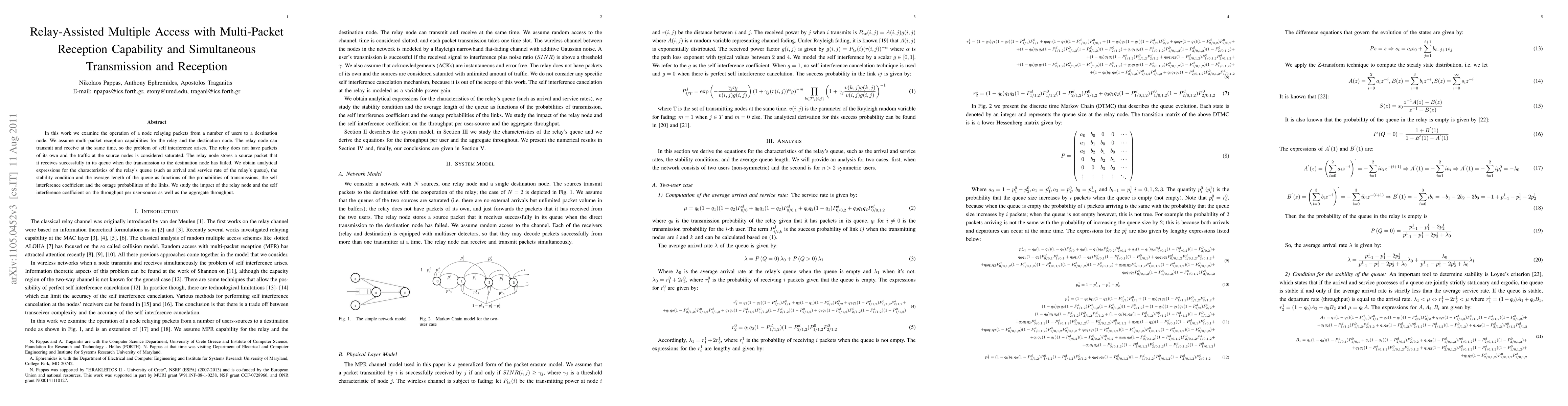 This paper investigates a relay-assisted multiple access system where a relay node forwards packets from multiple users to a destination, utilizing multi-packet reception and simultaneous transmission and reception capabilities. Analytical expressions are derived for the relay's queue characteristics, stability conditions, and throughput impacts, considering the effects of self-interference.