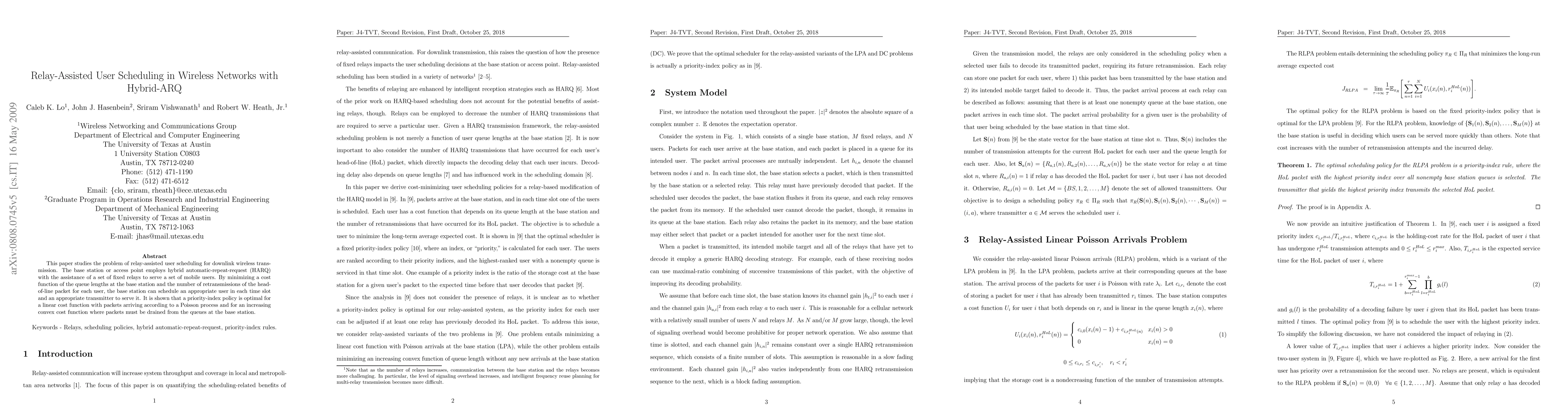 Researchers developed a scheduling policy for wireless networks using relays and hybrid-ARQ to minimize queue lengths and retransmissions, finding that a priority-index policy is optimal for certain cost functions.