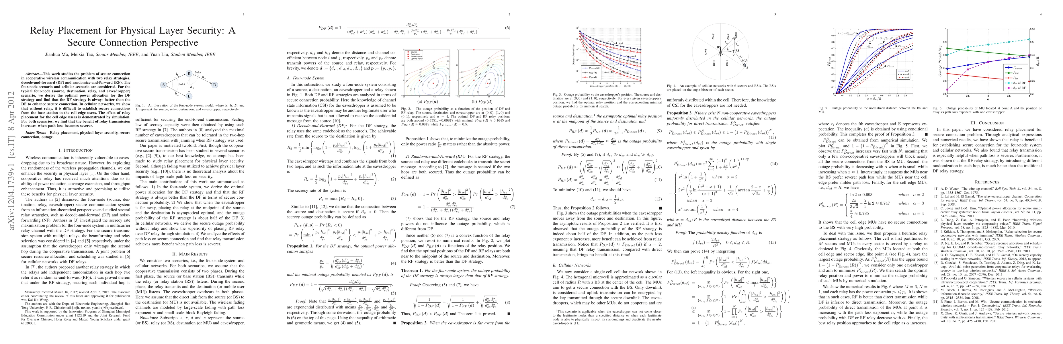 This paper investigates secure connection strategies in cooperative wireless networks using decode-and-forward (DF) and randomize-and-forward (RF) relaying. It finds that RF is superior for secure connections in typical four-node scenarios, while relay placement significantly enhances security in cellular networks.