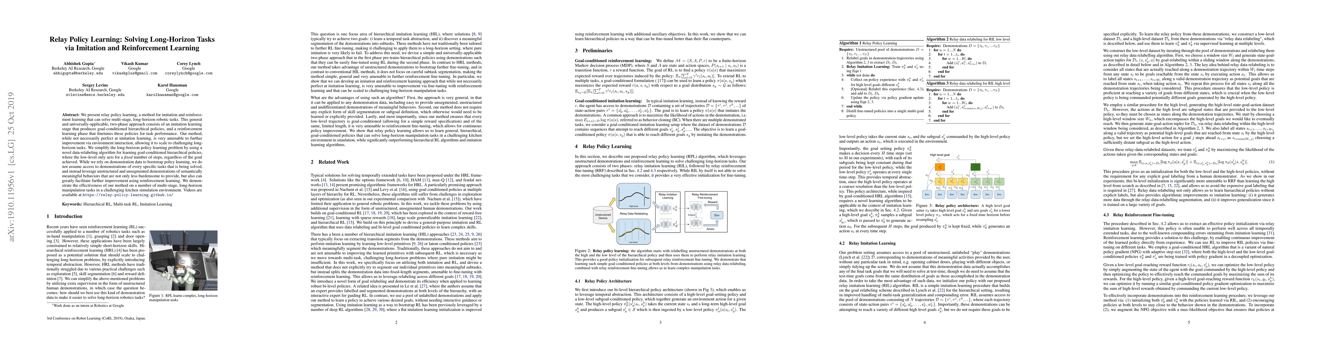 Relay policy learning combines imitation and reinforcement learning to tackle multi-stage, long-horizon robotic tasks by initially producing goal-conditioned hierarchical policies through imitation learning and then fine-tuning them via reinforcement learning. This scalable approach simplifies long-horizon policy learning with a data-relabeling technique, enabling improvements without needing specific task demonstrations.
