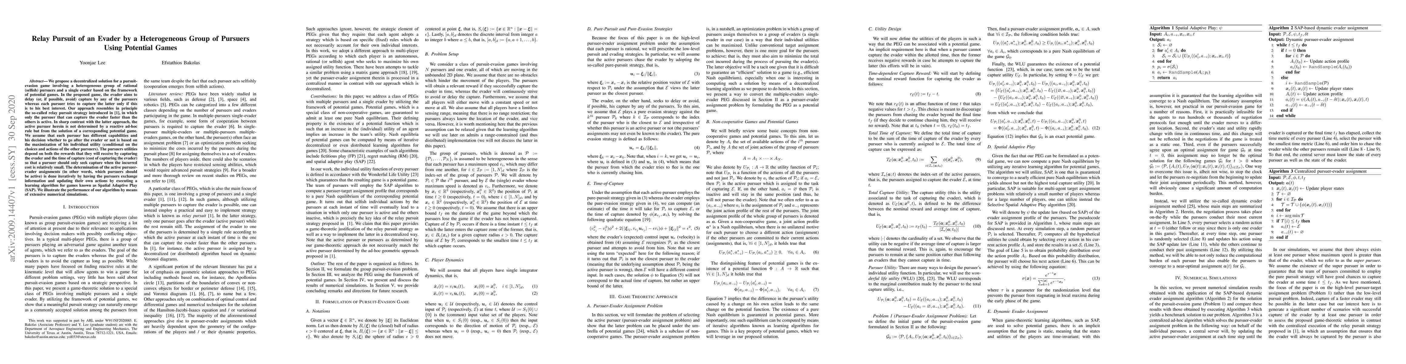 We propose a decentralized solution for a pursuit-evasion game involving a heterogeneous group of rational (selfish) pursuers and a single evader based on the framework of potential games. In the proposed game, the evader aims to delay (or, if possible, avoid) capture by any of the pursuers whereas each pursuer tries to capture the latter only if this is to his best interest. Our approach resembles in principle the so-called relay pursuit strategy introduced in [1], in which only the pursuer that can capture the evader faster than the others is active. In sharp contrast with the latter approach, the active pursuer herein is not determined by a reactive ad-hoc rule but from the solution of a corresponding potential game. We assume that each pursuer has different capabilities and his decision whether to go after the evader or not is based on the maximization of his individual utility (conditional on the choices and actions of the other pursuers). The pursuers' utilities depend on both the rewards that they will receive by capturing the evader and the time of capture (cost of capturing the evader) so that a pursuer should only seek capture when the incurred cost is relatively small. The determination of the active pursuer-evader assignments (in other words, which pursuers should be active) is done iteratively by having the pursuers exchange information and updating their own actions by executing a learning algorithm for games known as Spatial Adaptive Play (SAP). We illustrate the performance of our algorithm by means of extensive numerical simulations.