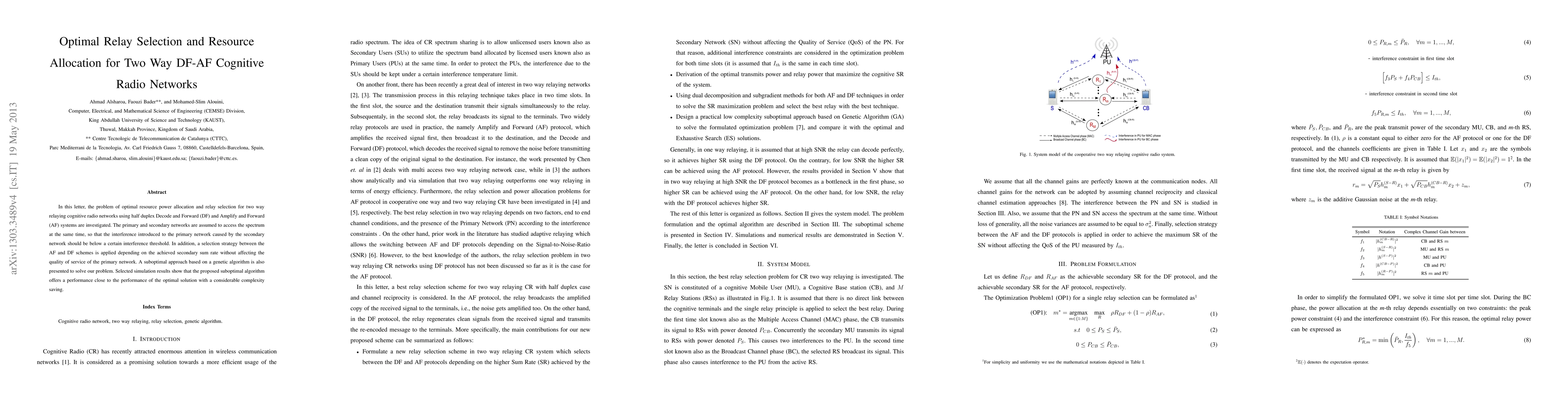 This paper investigates optimal resource power allocation and relay selection for two-way cognitive radio networks using DF and AF relaying schemes. A genetic algorithm is proposed to achieve near-optimal performance while minimizing interference to the primary network.
