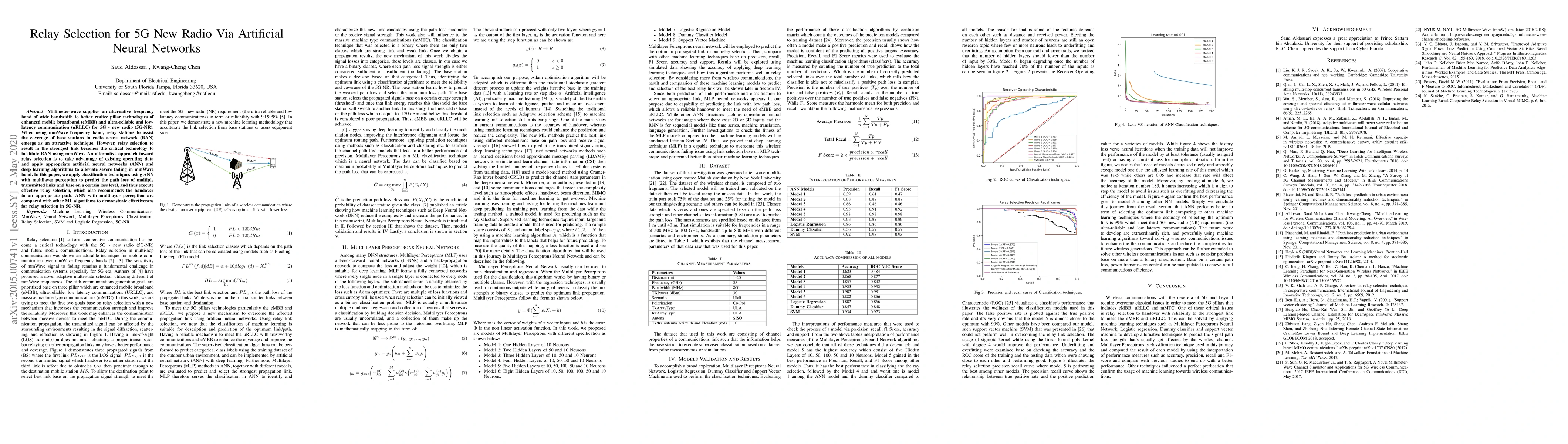 Millimeter-wave supplies an alternative frequency band of wide bandwidth to better realize pillar technologies of enhanced mobile broadband (eMBB) and ultra-reliable and lowlatency communication (uRLLC) for 5G - new radio (5G-NR). When using mmWave frequency band, relay stations to assist the coverage of base stations in radio access network (RAN) emerge as an attractive technique. However, relay selection to result in the strongest link becomes the critical technology to facilitate RAN using mmWave. A alternative approach toward relay selection is to take advantage of existing operating data and apply appropriate artificial neural networks (ANN) and deep learning algorithms to alleviate severe fading in mmWave band. In this paper, we apply classification techniques using ANN with multilayer perception to predict the path loss of multiple transmitted links and base on a certain loss level, and thus execute effective relay selection, which also recommends the handover to an appropriate path. ANN with multilayer perceptions are compared with other ML algorithms to demonstrate the effectiveness for relay selection in 5G-NR.