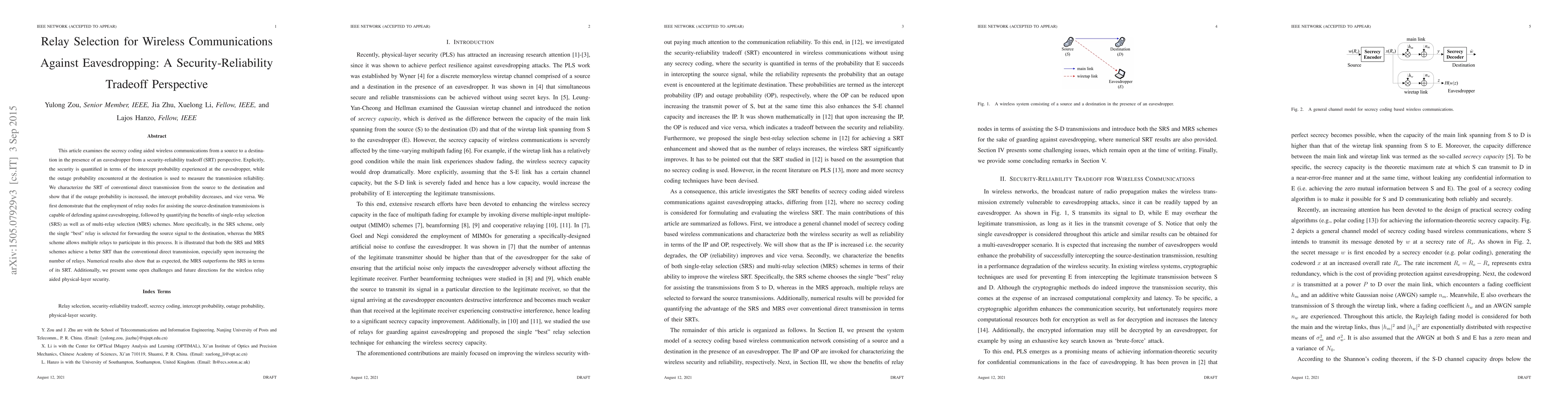 This article examines the secrecy coding aided wireless communications from a source to a destination in the presence of an eavesdropper from a security-reliability tradeoff (SRT) perspective. Explicitly, the security is quantified in terms of the intercept probability experienced at the eavesdropper, while the outage probability encountered at the destination is used to measure the transmission reliability. We characterize the SRT of conventional direct transmission from the source to the destination and show that if the outage probability is increased, the intercept probability decreases, and vice versa. We first demonstrate that the employment of relay nodes for assisting the source-destination transmissions is capable of defending against eavesdropping, followed by quantifying the benefits of single-relay selection (SRS) as well as of multi-relay selection (MRS) schemes. More specifically, in the SRS scheme, only the single "best" relay is selected for forwarding the source signal to the destination, whereas the MRS scheme allows multiple relays to participate in this process. It is illustrated that both the SRS and MRS schemes achieve a better SRT than the conventional direct transmission, especially upon increasing the number of relays. Numerical results also show that as expected, the MRS outperforms the SRS in terms of its SRT. Additionally, we present some open challenges and future directions for the wireless relay aided physical-layer security.
