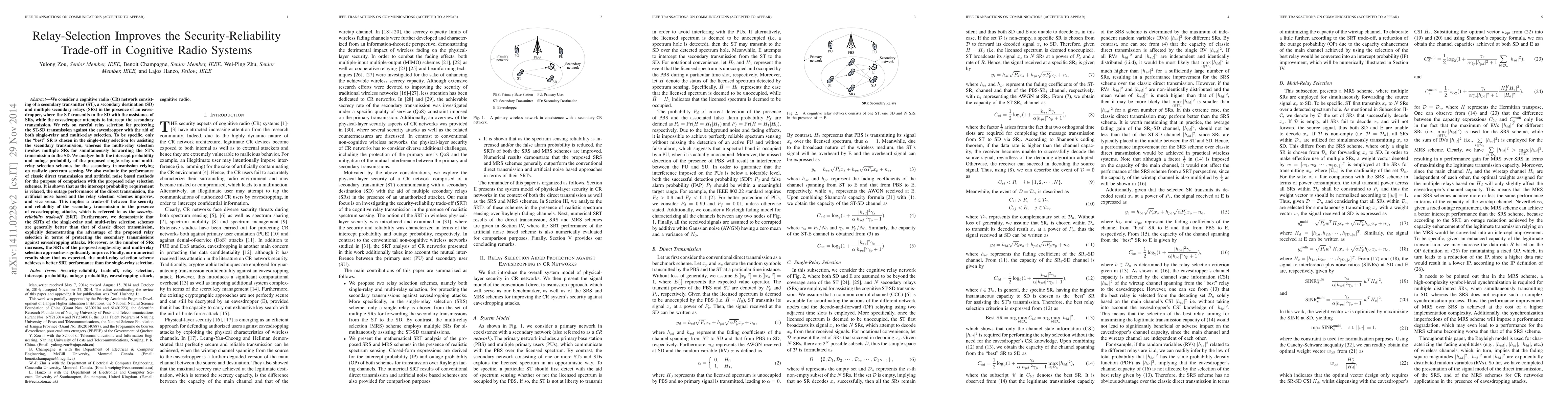 This paper investigates relay selection strategies in cognitive radio networks to enhance security-reliability trade-offs against eavesdropping. It compares single-relay and multi-relay selection schemes against direct transmission and artificial noise methods, showing that relay selection generally improves security-reliability trade-offs, especially with more relays.