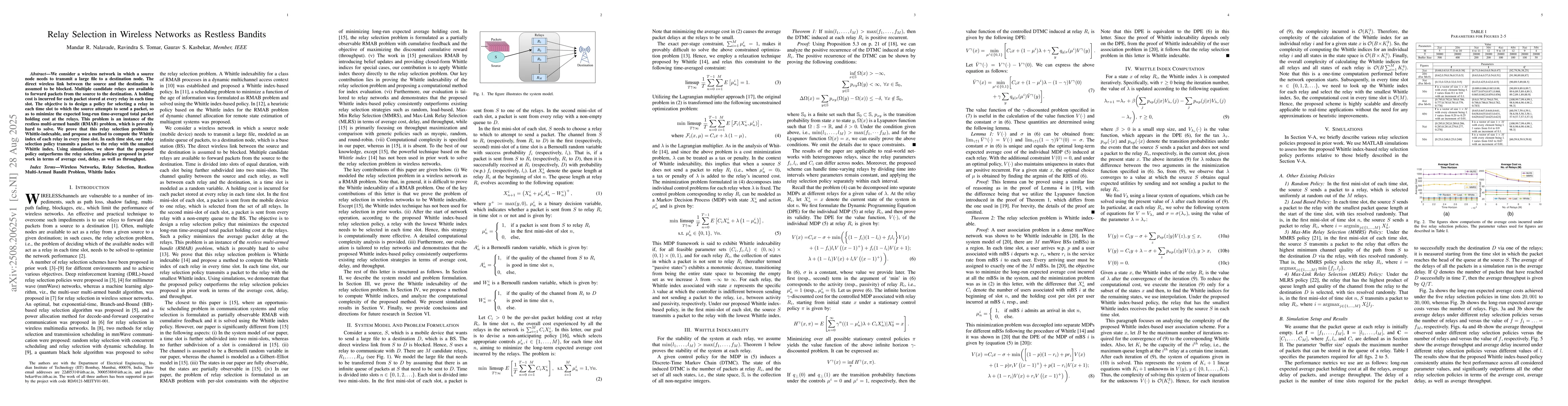 We consider a wireless network in which a source node needs to transmit a large file to a destination node. The direct wireless link between the source and the destination is assumed to be blocked. Multiple candidate relays are available to forward packets from the source to the destination. A holding cost is incurred for each packet stored at every relay in each time slot. The objective is to design a policy for selecting a relay in each time slot to which the source attempts to send a packet, so as to minimize the expected long-run time-averaged total packet holding cost at the relays. This problem is an instance of the restless multi-armed bandit (RMAB) problem, which is provably hard to solve. We prove that this relay selection problem is Whittle-indexable, and propose a method to compute the Whittle index of each relay in every time slot. In each time slot, our relay selection policy transmits a packet to the relay with the smallest Whittle index. Using simulations, we show that the proposed policy outperforms the relay selection policies proposed in prior work in terms of average cost, delay, as well as throughput.
