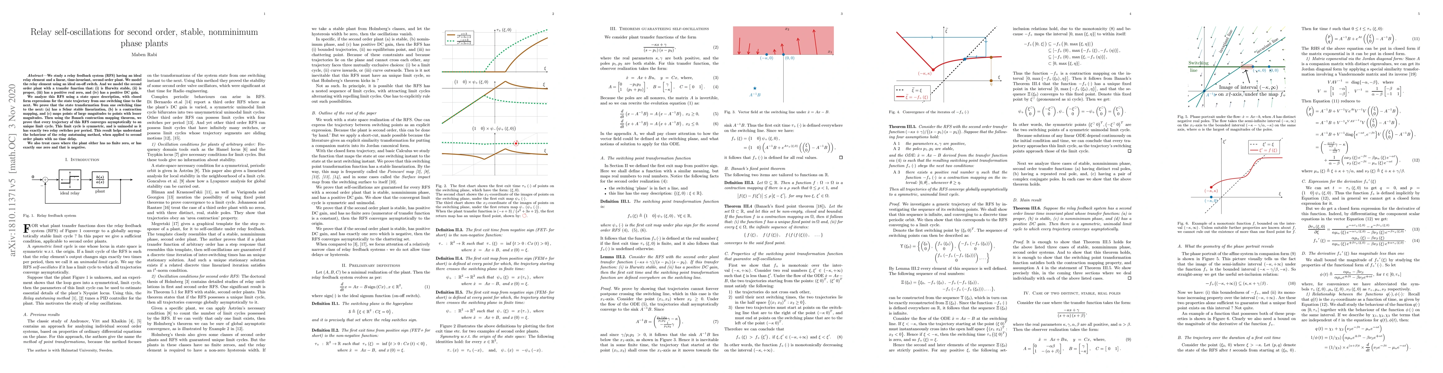 We study a relay feedback system (RFS) having an ideal relay element and a linear, time-invariant, second order plant. We model the relay element using an ideal on-off switch. And we model the second order plant with a transfer function that: (i) is Hurwitz stable, (ii) is proper, (iii) has a positive real zero, and (iv) has a positive DC gain. We analyze this RFS using a state space description, with closed form expressions for the state trajectory from one switching time to the next. We prove that the state transformation from one switching time to the next: (a) has a Schur stable linearization, (b) is a contraction mapping, and (c) maps points of large magnitudes to points with lesser magnitudes. Then using the Banach contraction mapping theorem, we prove that every trajectory of this RFS converges asymptotically to an unique limit cycle. This limit cycle is symmetric, and is unimodal as it has exactly two relay switches per period. This result helps understand the behaviour of the relay autotuning method, when applied to second order plants with no time delay. We also treat cases where the plant either has no finite zero, or has exactly one zero and that is negative.