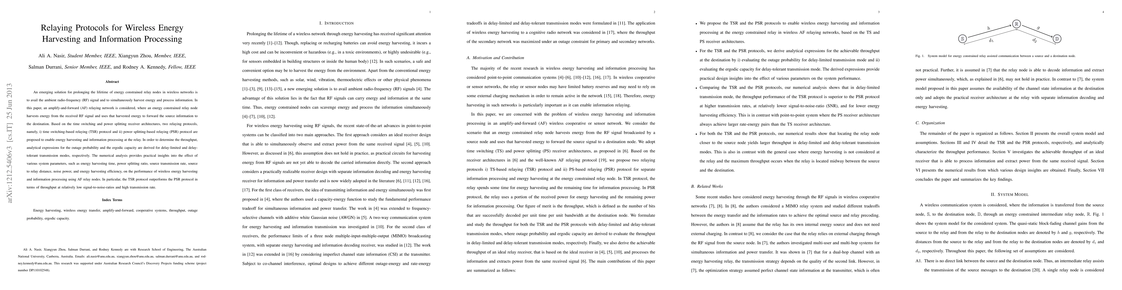 This paper proposes two amplify-and-forward relaying protocols for wireless networks to enhance the lifetime of energy-constrained relay nodes through energy harvesting from ambient RF signals. The TSR protocol outperforms the PSR protocol in throughput under low SNR and high transmission rates, while analytical expressions are derived for outage probability and ergodic capacity.