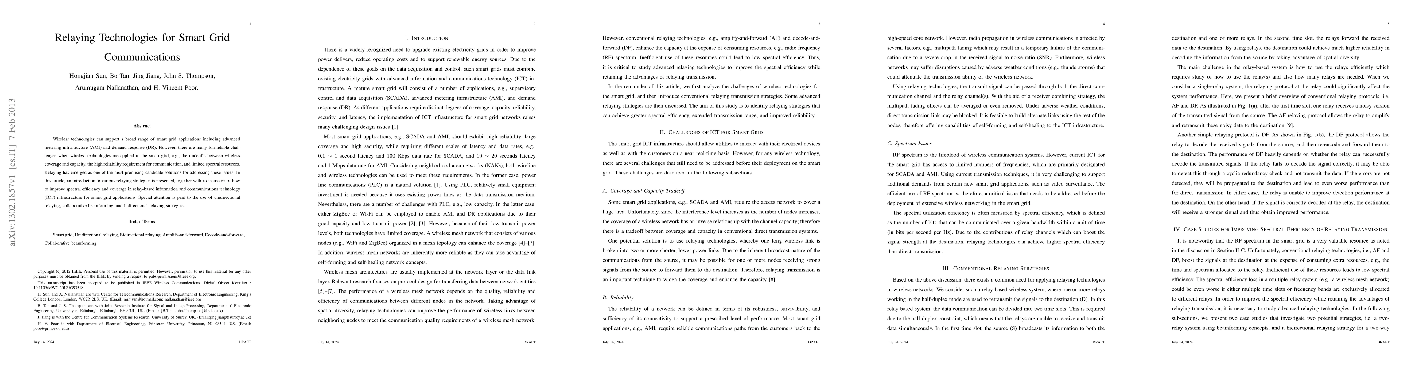 This paper introduces various relaying strategies to enhance smart grid communications, addressing challenges such as coverage, capacity, and reliability. It focuses on improving spectral efficiency and coverage through unidirectional, collaborative beamforming, and bidirectional relaying techniques.