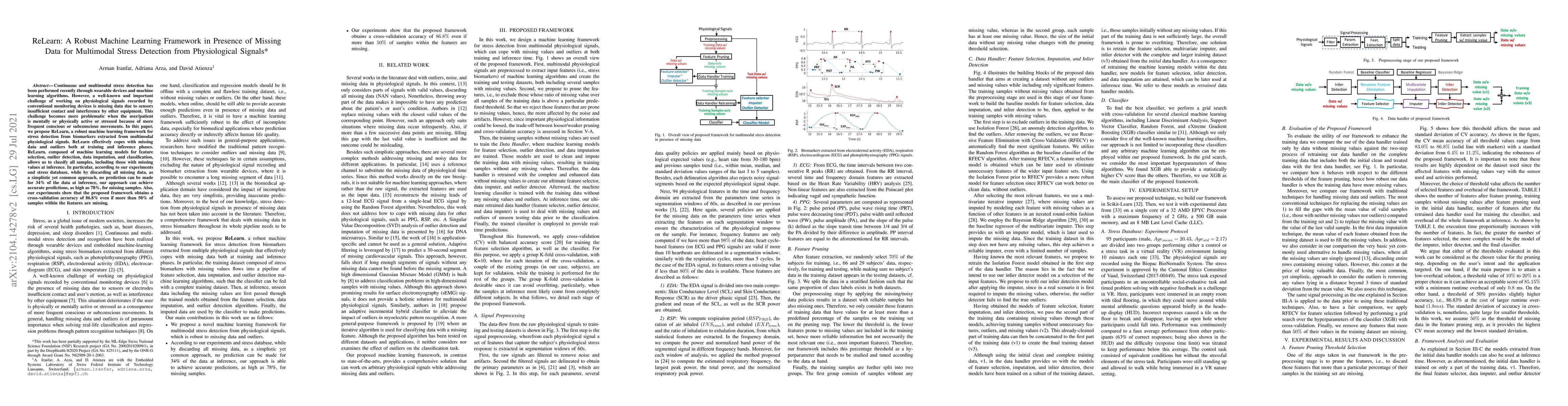 ReLearn is a robust machine learning framework designed for multimodal stress detection from physiological signals, addressing the challenge of missing data. It achieves high accuracy in stress classification, even when over 50% of feature data is missing, outperforming traditional methods that discard incomplete data.