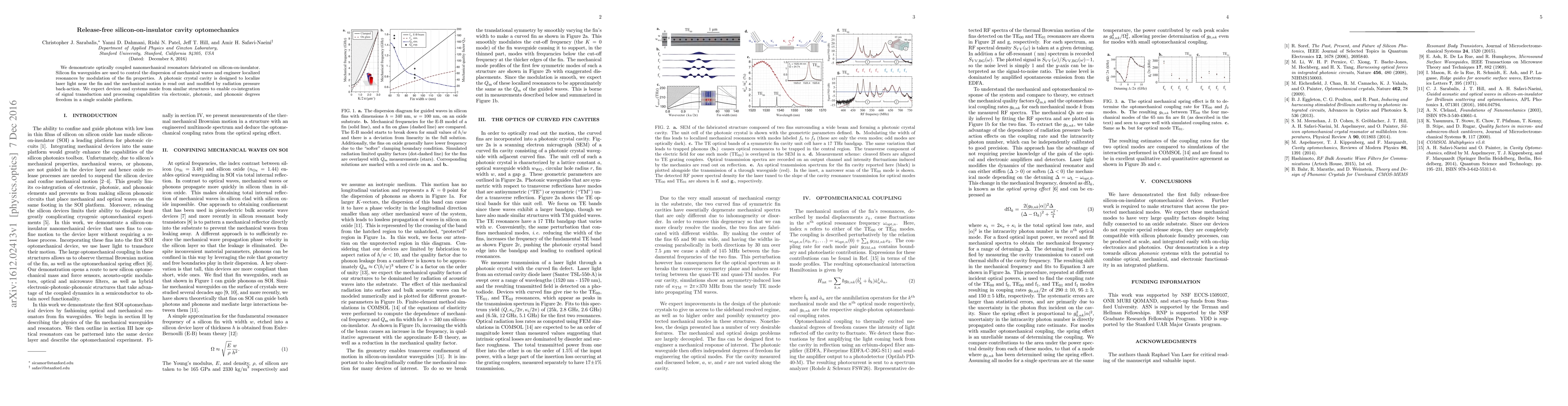 This paper presents a silicon-on-insulator platform for cavity optomechanics, utilizing silicon fin waveguides to control mechanical waves and photonic crystal cavities to localize light, enabling signal transduction and processing integration. The demonstrated optically coupled nanomechanical resonators show potential for scalable, multifunctional devices.