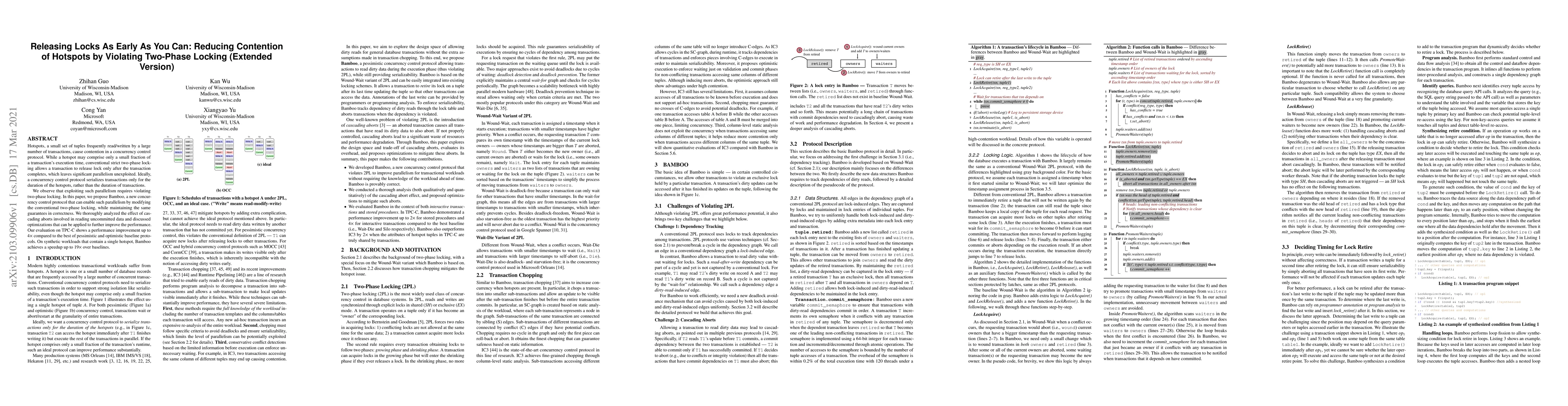 Hotspots, a small set of tuples frequently read/written by a large number of transactions, cause contention in a concurrency control protocol. While a hotspot may comprise only a small fraction of a transaction's execution time, conventional strict two-phase locking allows a transaction to release lock only after the transaction completes, which leaves significant parallelism unexploited. Ideally, a concurrency control protocol serializes transactions only for the duration of the hotspots, rather than the duration of transactions. We observe that exploiting such parallelism requires violating two-phase locking. In this paper, we propose Bamboo, a new concurrency control protocol that can enable such parallelism by modifying the conventional two-phase locking, while maintaining the same guarantees in correctness. We thoroughly analyzed the effect of cascading aborts involved in reading uncommitted data and discussed optimizations that can be applied to further improve the performance. Our evaluation on TPC-C shows a performance improvement up to 4x compared to the best of pessimistic and optimistic baseline protocols. On synthetic workloads that contain a single hotspot, Bamboo achieves a speedup up to 19x over baselines.