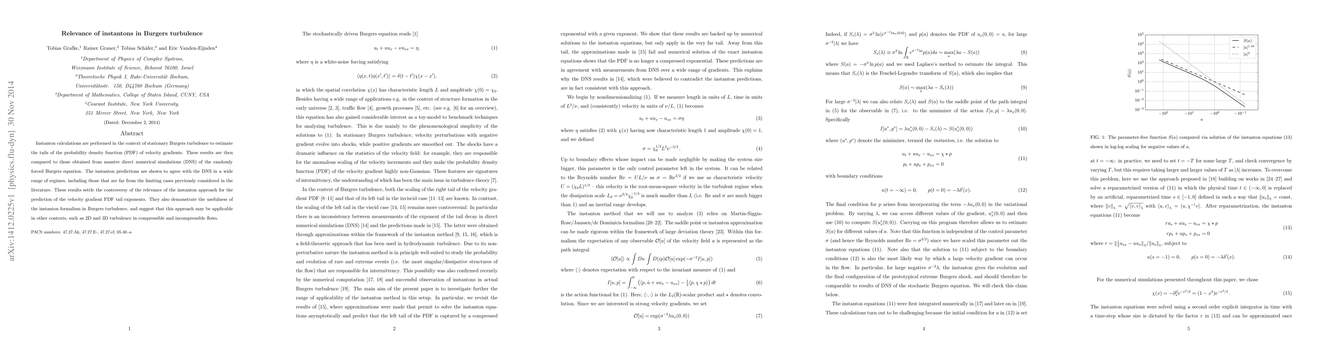 Instanton calculations are performed in the context of stationary Burgers turbulence to estimate the tails of the probability density function (PDF) of velocity gradients. These results are then compared to those obtained from massive direct numerical simulations (DNS) of the randomly forced Burgers equation. The instanton predictions are shown to agree with the DNS in a wide range of regimes, including those that are far from the limiting cases previously considered in the literature. These results settle the controversy of the relevance of the instanton approach for the prediction of the velocity gradient PDF tail exponents. They also demonstrate the usefulness of the instanton formalism in Burgers turbulence, and suggest that this approach may be applicable in other contexts, such as 2D and 3D turbulence in compressible and incompressible flows.