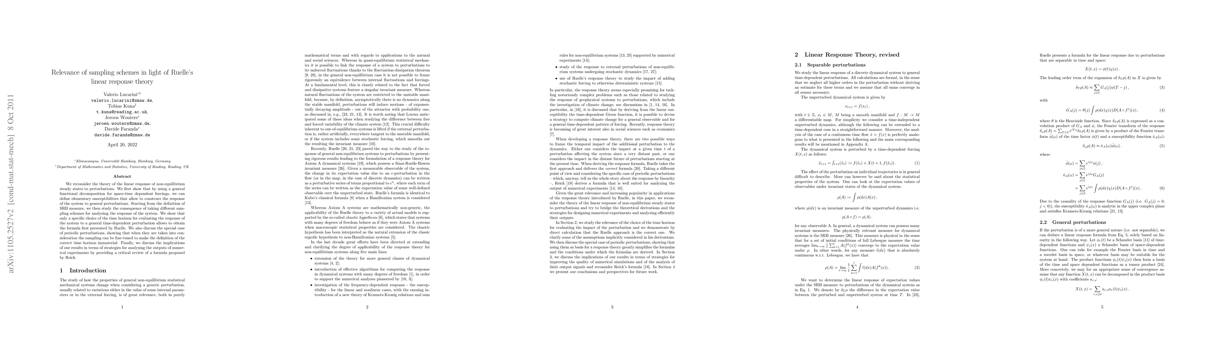 We reconsider the theory of the linear response of non-equilibrium steady states to perturbations. We first show that by using a general functional decomposition for space-time dependent forcings, we can define elementary susceptibilities that allow to construct the response of the system to general perturbations. Starting from the definition of SRB measure, we then study the consequence of taking different sampling schemes for analysing the response of the system. We show that only a specific choice of the time horizon for evaluating the response of the system to a general time-dependent perturbation allows to obtain the formula first presented by Ruelle. We also discuss the special case of periodic perturbations, showing that when they are taken into consideration the sampling can be fine-tuned to make the definition of the correct time horizon immaterial. Finally, we discuss the implications of our results in terms of strategies for analyzing the outputs of numerical experiments by providing a critical review of a formula proposed by Reick.