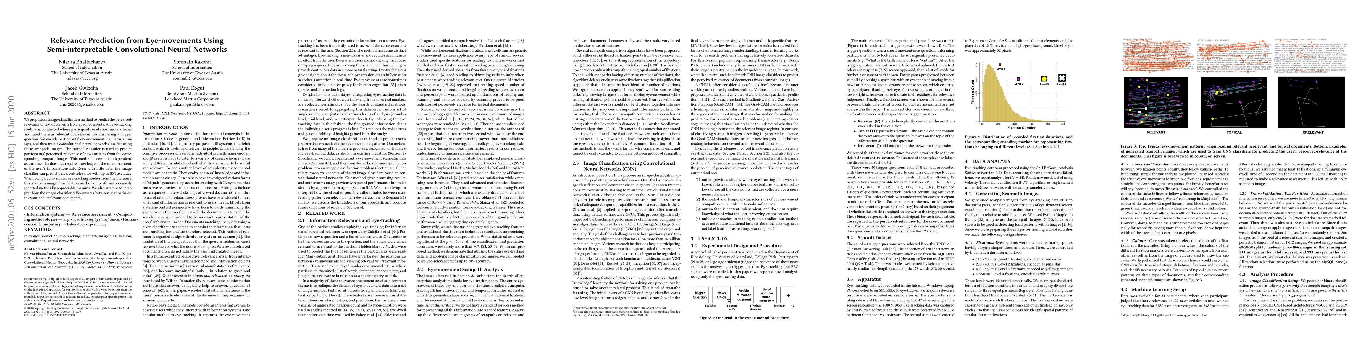 We propose an image-classification method to predict the perceived-relevance of text documents from eye-movements. An eye-tracking study was conducted where participants read short news articles, and rated them as relevant or irrelevant for answering a trigger question. We encode participants' eye-movement scanpaths as images, and then train a convolutional neural network classifier using these scanpath images. The trained classifier is used to predict participants' perceived-relevance of news articles from the corresponding scanpath images. This method is content-independent, as the classifier does not require knowledge of the screen-content, or the user's information-task. Even with little data, the image classifier can predict perceived-relevance with up to 80% accuracy. When compared to similar eye-tracking studies from the literature, this scanpath image classification method outperforms previously reported metrics by appreciable margins. We also attempt to interpret how the image classifier differentiates between scanpaths on relevant and irrelevant documents.