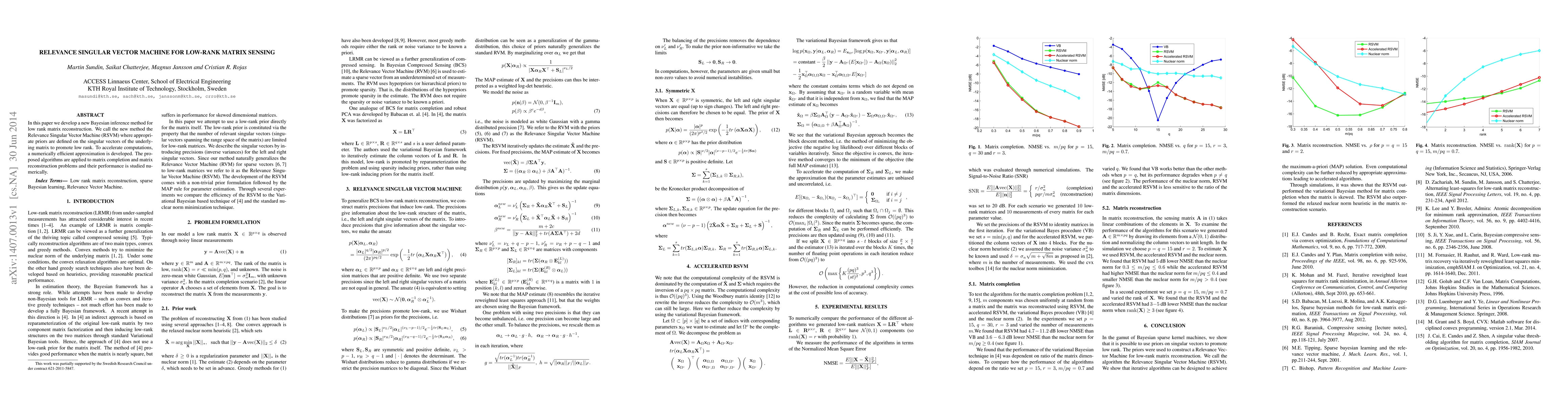 This paper introduces the Relevance Singular Vector Machine (RSVM), a Bayesian inference method for low-rank matrix reconstruction, utilizing priors on singular vectors to promote low rank. An efficient approximation is developed to accelerate computations, and the method is applied to matrix completion and reconstruction tasks.