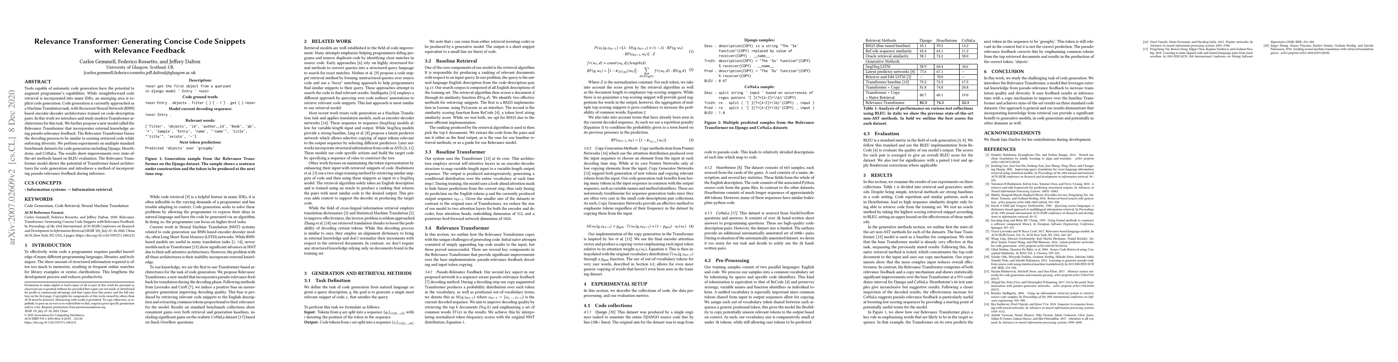 The Relevance Transformer leverages modern Transformer architectures to generate concise code snippets, incorporating pseudo-relevance feedback to enhance relevance and diversity. Experiments on various datasets demonstrate its superior performance over existing methods, indicating the potential of Transformer-based models for code generation.