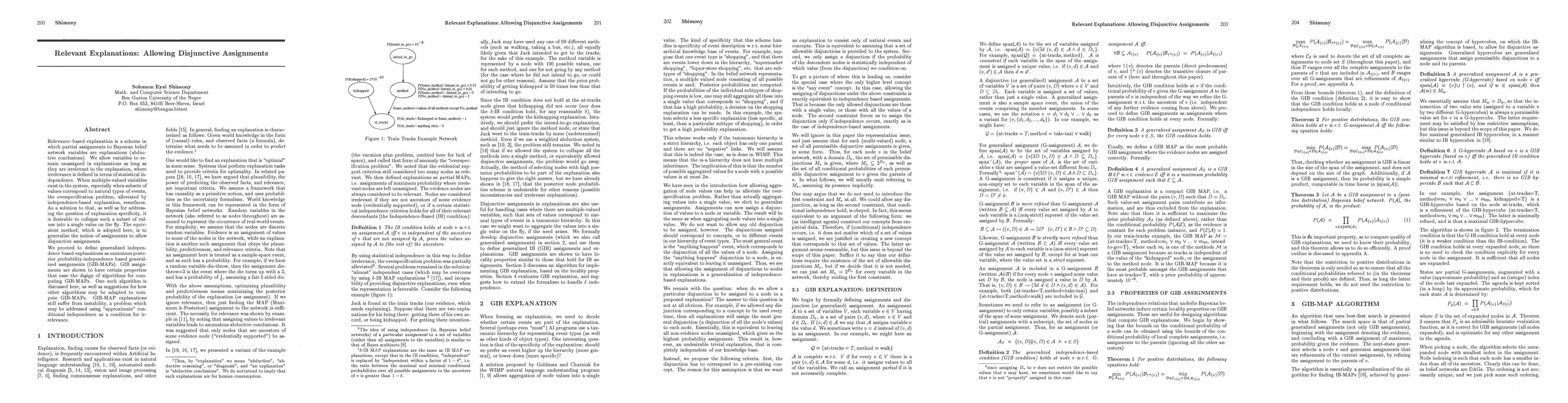 This paper proposes a method to allow disjunctive assignments in relevance-based explanations for Bayesian belief networks, addressing the over-specification problem by collapsing subsets of values into single values. It introduces generalized independence based explanations (GIB-MAPs) and discusses an algorithm for computing them, along with suggestions for adapting other algorithms. The instability of GIB-MAPs is mitigated by using approximate conditional independence for irrelevance.
