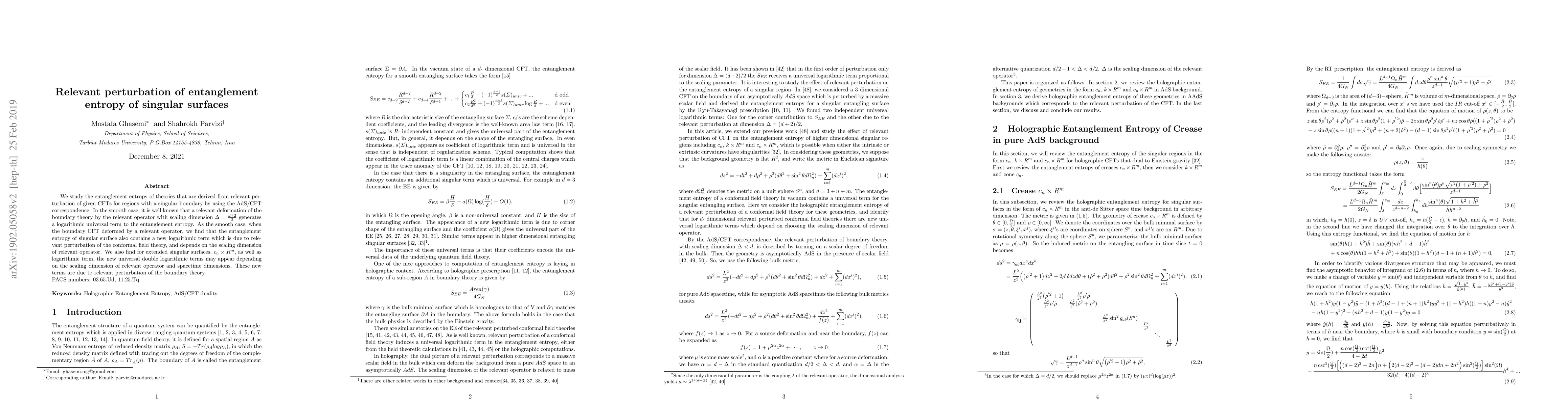 This paper investigates the entanglement entropy of singular surfaces in theories derived from relevant perturbations of conformal field theories (CFTs) via the AdS/CFT correspondence. It finds that such perturbations introduce a logarithmic term in the entanglement entropy, similar to the smooth case, and also identifies new universal double logarithmic terms for extended singular surfaces, dependent on the scaling dimension of the relevant operator and spacetime dimensions.