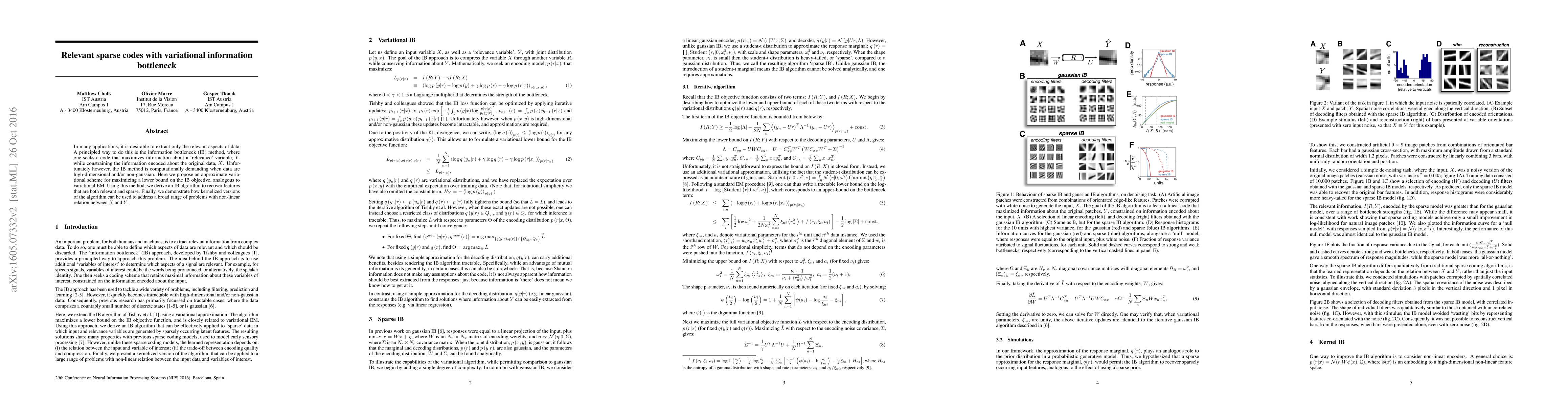 In many applications, it is desirable to extract only the relevant aspects of data. A principled way to do this is the information bottleneck (IB) method, where one seeks a code that maximizes information about a 'relevance' variable, Y, while constraining the information encoded about the original data, X. Unfortunately however, the IB method is computationally demanding when data are high-dimensional and/or non-gaussian. Here we propose an approximate variational scheme for maximizing a lower bound on the IB objective, analogous to variational EM. Using this method, we derive an IB algorithm to recover features that are both relevant and sparse. Finally, we demonstrate how kernelized versions of the algorithm can be used to address a broad range of problems with non-linear relation between X and Y.