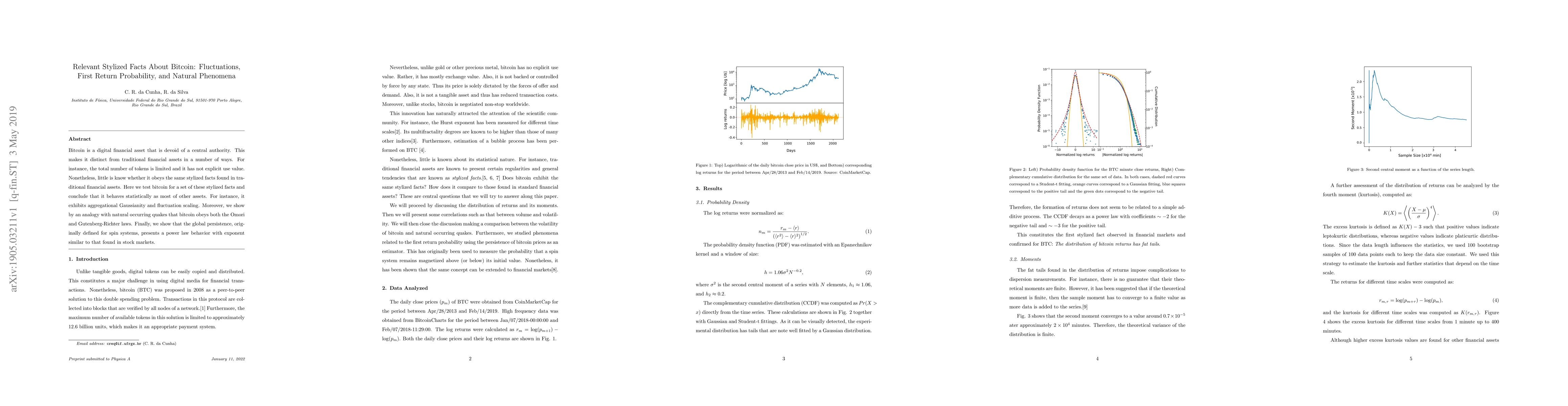 Bitcoin is a digital financial asset that is devoid of a central authority. This makes it distinct from traditional financial assets in a number of ways. For instance, the total number of tokens is limited and it has not explicit use value. Nonetheless, little is know whether it obeys the same stylized facts found in traditional financial assets. Here we test bitcoin for a set of these stylized facts and conclude that it behaves statistically as most of other assets. For instance, it exhibits aggregational Gaussianity and fluctuation scaling. Moreover, we show by an analogy with natural occurring quakes that bitcoin obeys both the Omori and Gutenberg-Richter laws. Finally, we show that the global persistence, originally defined for spin systems, presents a power law behavior with exponent similar to that found in stock markets.