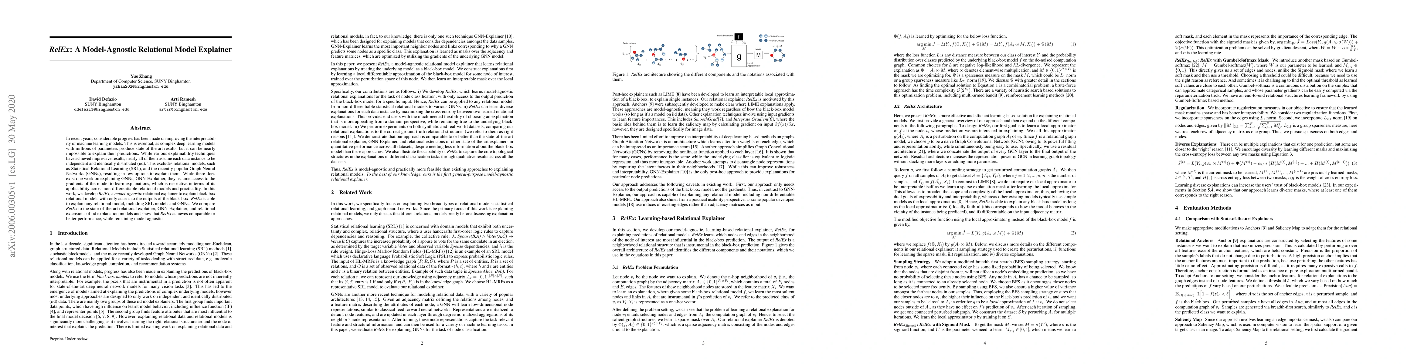 RelEx is a model-agnostic explainer designed to interpret black-box relational models, including Statistical Relational Learning and Graph Neural Networks, without requiring access to model gradients. It achieves comparable or better performance compared to existing explainers like GNN-Explainer.