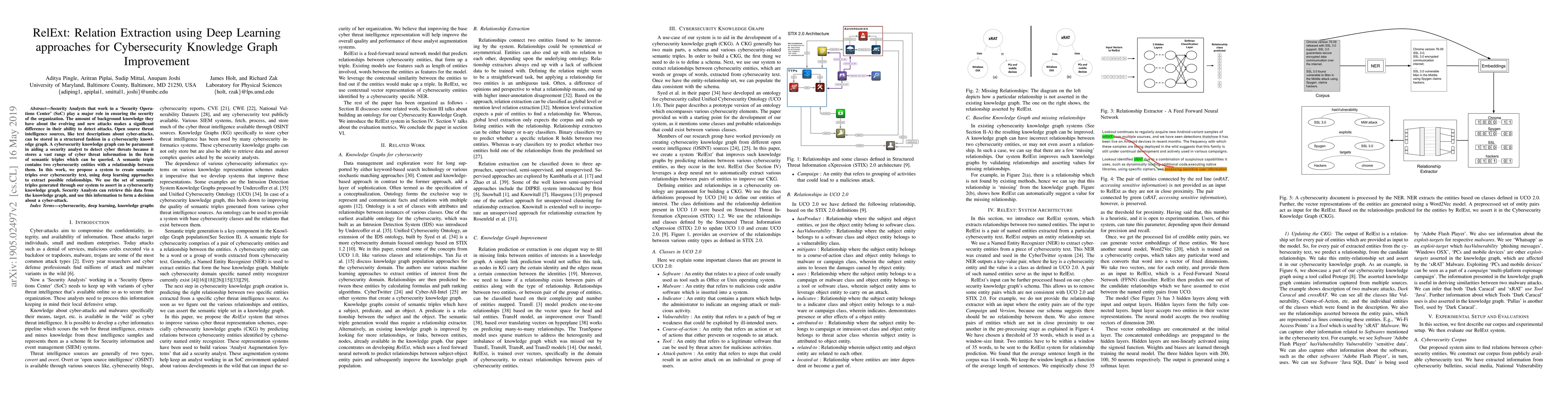 Security Analysts that work in a `Security Operations Center' (SoC) play a major role in ensuring the security of the organization. The amount of background knowledge they have about the evolving and new attacks makes a significant difference in their ability to detect attacks. Open source threat intelligence sources, like text descriptions about cyber-attacks, can be stored in a structured fashion in a cybersecurity knowledge graph. A cybersecurity knowledge graph can be paramount in aiding a security analyst to detect cyber threats because it stores a vast range of cyber threat information in the form of semantic triples which can be queried. A semantic triple contains two cybersecurity entities with a relationship between them. In this work, we propose a system to create semantic triples over cybersecurity text, using deep learning approaches to extract possible relationships. We use the set of semantic triples generated through our system to assert in a cybersecurity knowledge graph. Security Analysts can retrieve this data from the knowledge graph, and use this information to form a decision about a cyber-attack.