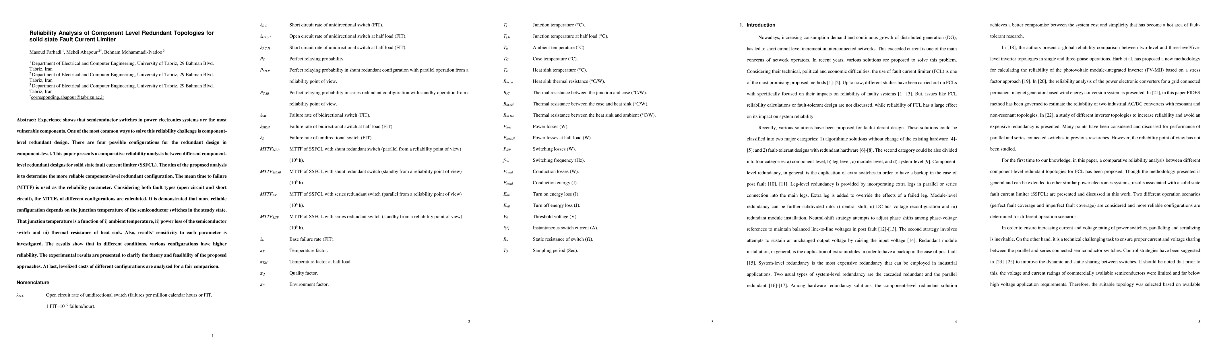 Experience shows that semiconductor switches in power electronics systems are the most vulnerable components. One of the most common ways to solve this reliability challenge is component-level redundant design. There are four possible configurations for the redundant design in component-level. This paper presents a comparative reliability analysis between different component-level redundant designs for solid state fault current limiter (SSFCL). The aim of the proposed analysis is to determine the more reliable component-level redundant configuration. The mean time to failure (MTTF) is used as the reliability parameter. Considering both fault types (open circuit and short circuit), the MTTFs of different configurations are calculated. It is demonstrated that more reliable configuration depends on the junction temperature of the semiconductor switches in the steady state. That junction temperature is a function of i) ambient temperature, ii) power loss of the semiconductor switch and iii) thermal resistance of heat sink. Also, results sensitivity to each parameter is investigated. The results show that in different conditions, various configurations have higher reliability. The experimental results are presented to clarify the theory and feasibility of the proposed approaches. At last, levelized costs of different configurations are analyzed for a fair comparison.