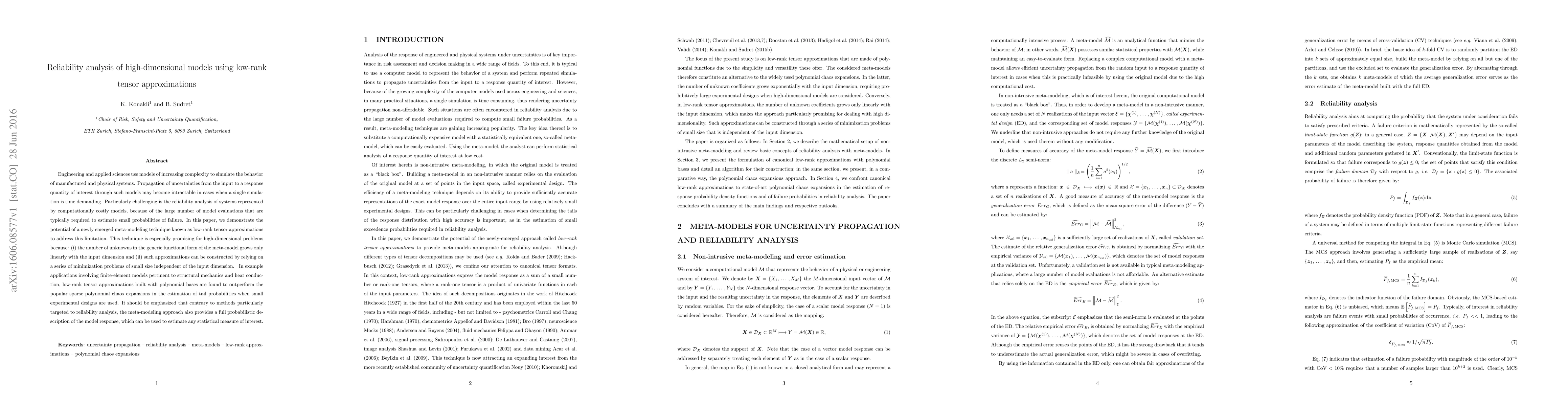 This paper explores the use of low-rank tensor approximations for high-dimensional reliability analysis in computationally expensive models, demonstrating their efficiency in estimating failure probabilities with fewer model evaluations compared to sparse polynomial chaos expansions. The method offers a full probabilistic description of model responses, making it versatile for various statistical measures.