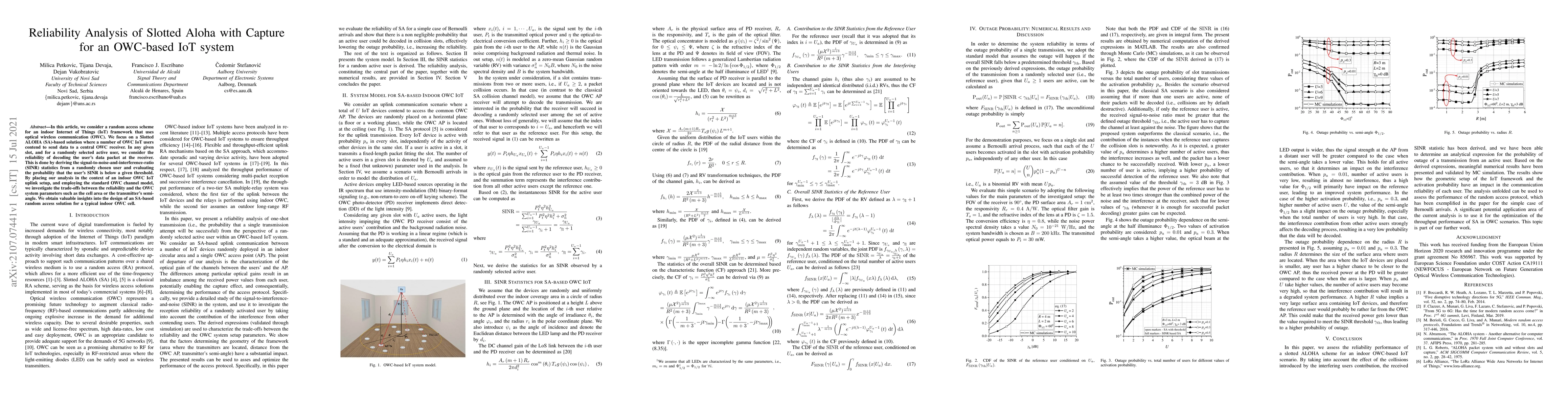 In this article, we consider a random access scheme for an indoor Internet of Things (IoT) framework that uses optical wireless communication (OWC). We focus on a Slotted ALOHA (SA)-based solution where a number of OWC IoT users contend to send data to a central OWC receiver. In any given slot, and for a randomly selected active user, we consider the reliability of decoding the user's data packet at the receiver. This is done by deriving the signal-to-noise-and-interference-ratio (SINR) statistics from a randomly chosen user and evaluating the probability that the user's SINR is below a given threshold. By placing our analysis in the context of an indoor OWC IoT uplink setup, and employing the standard OWC channel model, we investigate the trade-offs between the reliability and the OWC system parameters such as the cell area or the transmitter's semi-angle. We obtain valuable insights into the design of an SA-based random access solution for a typical indoor OWC cell.
