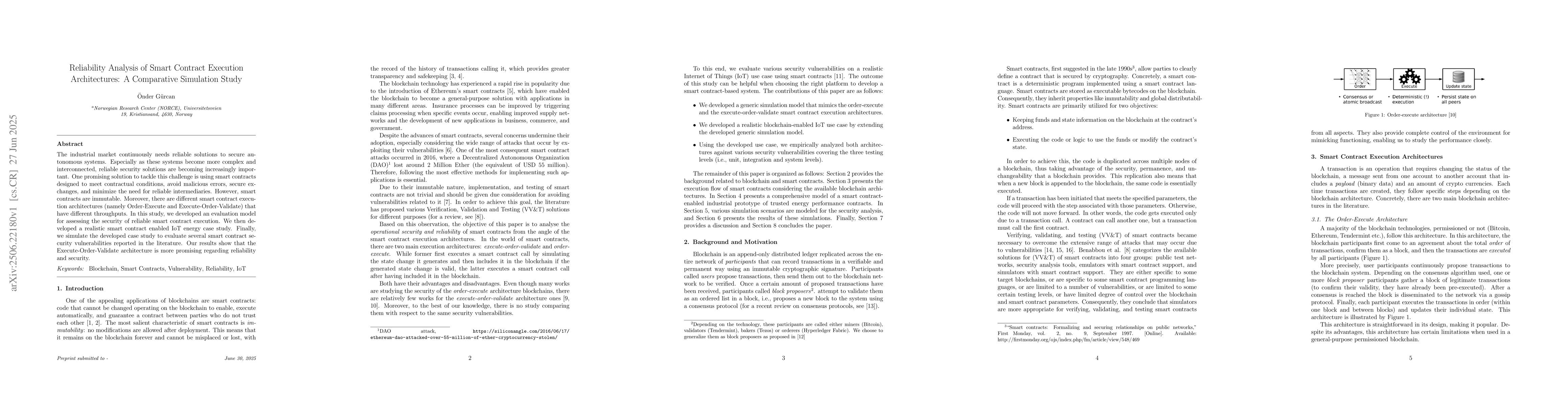 The industrial market continuously needs reliable solutions to secure autonomous systems. Especially as these systems become more complex and interconnected, reliable security solutions are becoming increasingly important. One promising solution to tackle this challenge is using smart contracts designed to meet contractual conditions, avoid malicious errors, secure exchanges, and minimize the need for reliable intermediaries. However, smart contracts are immutable. Moreover, there are different smart contract execution architectures (namely Order-Execute and Execute-Order-Validate) that have different throughputs. In this study, we developed an evaluation model for assessing the security of reliable smart contract execution. We then developed a realistic smart contract enabled IoT energy case study. Finally, we simulate the developed case study to evaluate several smart contract security vulnerabilities reported in the literature. Our results show that the Execute-Order-Validate architecture is more promising regarding reliability and security.