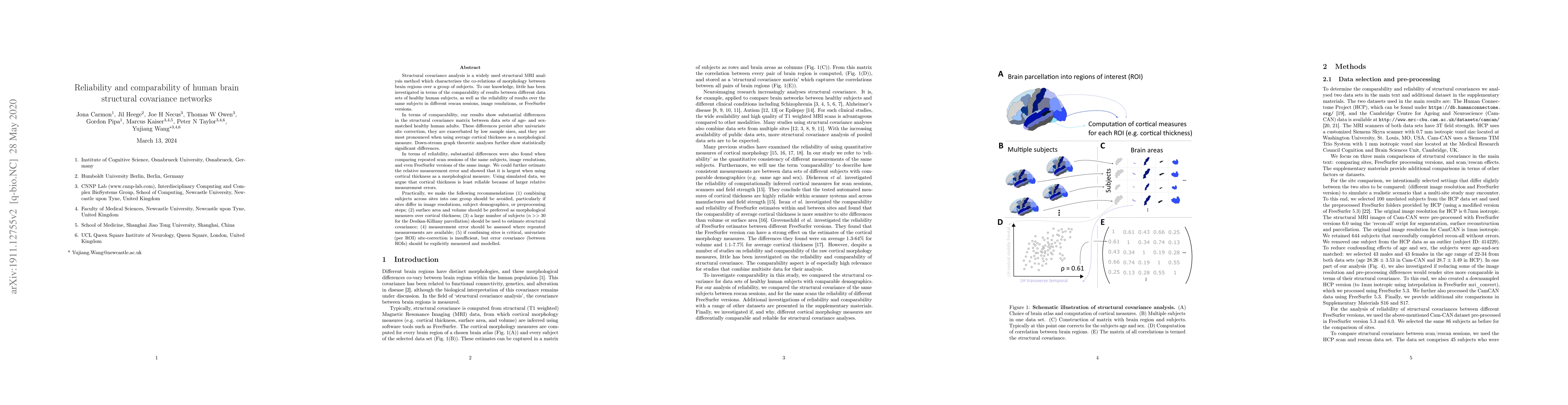 This study investigates the reliability and comparability of human brain structural covariance networks derived from MRI data. It finds significant differences in structural covariance matrices across different datasets and repeated scans, particularly when using cortical thickness as a measure. Recommendations include avoiding pooling subjects from different sites, preferring surface area and volume over cortical thickness, using large sample sizes, assessing measurement error, and explicitly modeling error covariance when combining datasets.