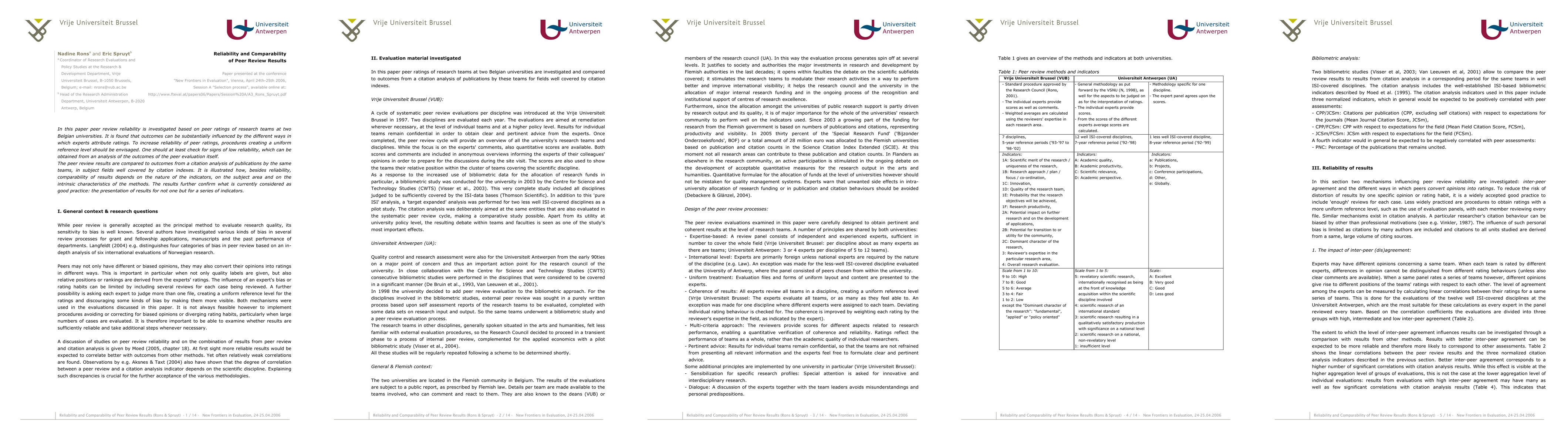 This paper examines the reliability and comparability of peer review results in research teams from two Belgian universities, finding that outcomes vary significantly based on expert rating methods. To enhance reliability, it suggests implementing procedures that establish a uniform reference level and analyzing peer evaluation outcomes for signs of low reliability. It also compares peer review results with citation analysis, highlighting that comparability depends on indicator nature, subject area, and method characteristics.