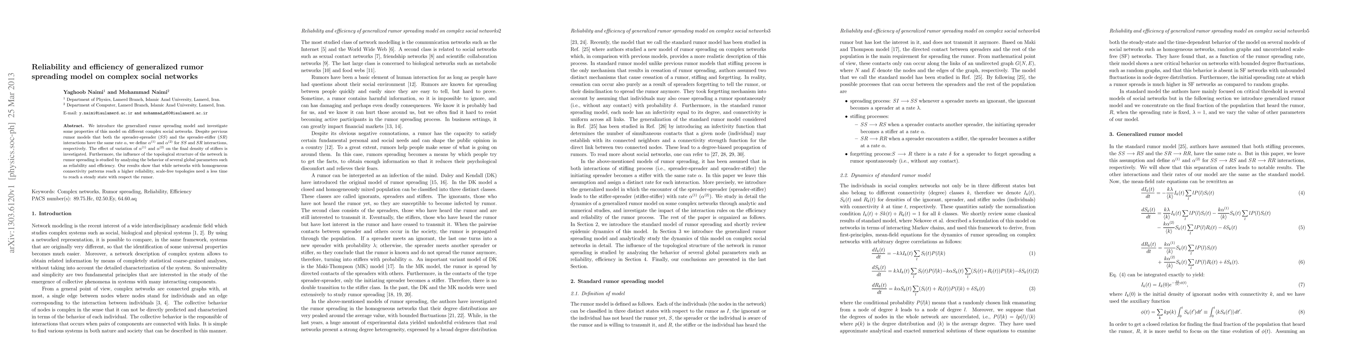 We introduce the generalized rumor spreading model and investigate some properties of this model on different complex social networks. Despite pervious rumor models that both the spreader-spreader ($SS$) and the spreader-stifler ($SR$) interactions have the same rate $\alpha$, we define $\alpha^{(1)}$ and $\alpha^{(2)}$ for $SS$ and $SR$ interactions, respectively. The effect of variation of $\alpha^{(1)}$ and $\alpha^{(2)}$ on the final density of stiflers is investigated. Furthermore, the influence of the topological structure of the network in rumor spreading is studied by analyzing the behavior of several global parameters such as reliability and efficiency. Our results show that while networks with homogeneous connectivity patterns reach a higher reliability, scale-free topologies need a less time to reach a steady state with respect the rumor.