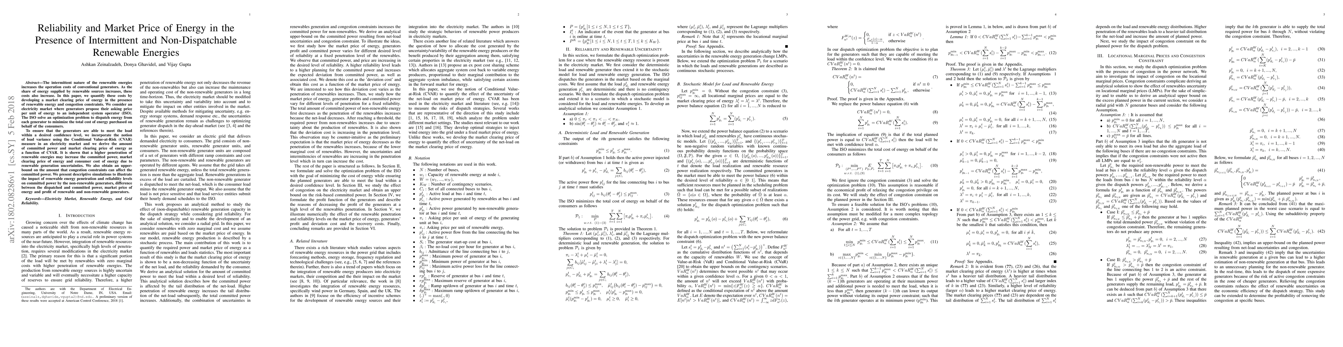 The intermittent nature of the renewable energies increases the operation costs of conventional generators. As the share of energy supplied by renewable sources increases, these costs also increase. In this paper, we quantify these costs by developing a market clearing price of energy in the presence of renewable energy and congestion constraints. We consider an electricity market where generators propose their asking price per unit of energy to an independent system operator (ISO). The ISO solve an optimization problem to dispatch energy from each generator to minimize the total cost of energy purchased on behalf of the consumers. To ensure that the generators are able to meet the load within a desired confidence level, we incorporate the notion of load variance using the Conditional Value-at-Risk (CVAR) measure in an electricity market and we derive the amount of committed power and market clearing price of energy as a function of CVAR. It is shown that a higher penetration of renewable energies may increase the committed power, market clearing price of energy and consumer cost of energy due to renewable generation uncertainties. We also obtain an upper-bound on the amount that congestion constraints can affect the committed power. We present descriptive simulations to illustrate the impact of renewable energy penetration and reliability levels on committed power by the non-renewable generators, difference between the dispatched and committed power, market price of energy and profit of renewable and non-renewable generators.