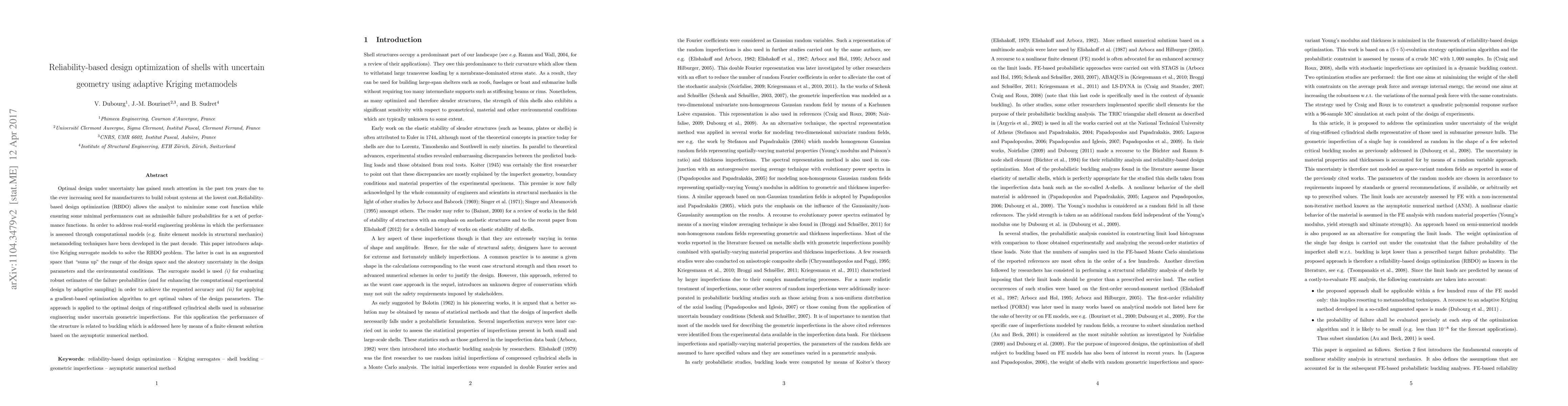 This paper proposes adaptive Kriging metamodels for reliability-based design optimization (RBDO) of shells with uncertain geometry, focusing on minimizing costs while ensuring minimal performance under failure probabilities. The method enhances computational design through adaptive sampling and gradient-based optimization for optimal design of ring-stiffened cylindrical shells.