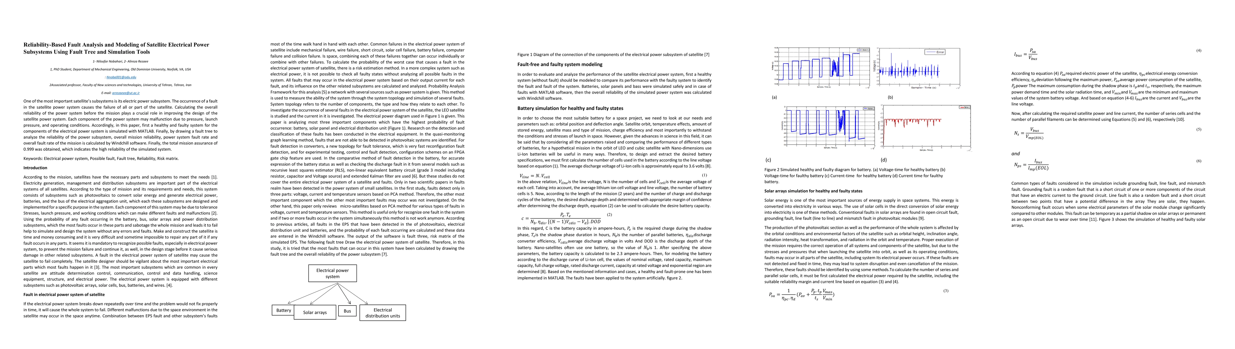 One of the most important satellite subsystems is its electric power subsystem. The occurrence of a fault in the satellite power system causes the failure of all or part of the satellite. Calculating the overall reliability of the power system before the mission is crucial in improving the design of the satellite power system. Each component of the power system may malfunction due to pressure, launch pressure, and operating conditions. Accordingly, in this paper, first, a healthy and faulty system for the components of the electrical power system is simulated with MATLAB. Finally, by drawing a fault tree to analyze the reliability of the power subsystem, overall mission reliability, power system fault rate, and overall fault rate of the mission are calculated by Windchill software. Finally, a total mission assurance of 0.999 was achieved, indicating the high reliability of the simulated system.
