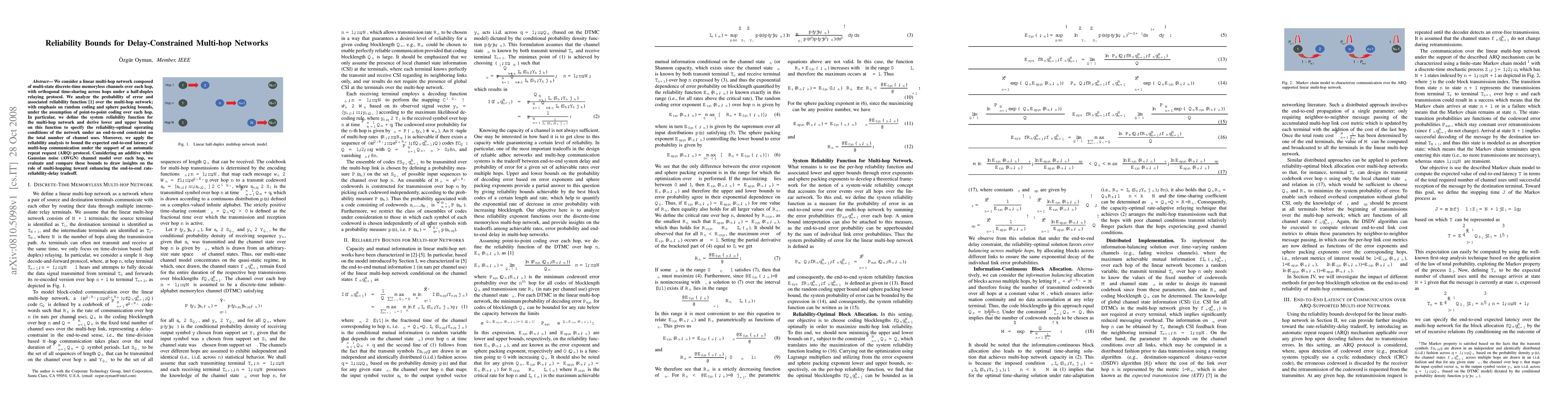 We consider a linear multi-hop network composed of multi-state discrete-time memoryless channels over each hop, with orthogonal time-sharing across hops under a half-duplex relaying protocol. We analyze the probability of error and associated reliability function \cite{Gallager68} over the multi-hop network; with emphasis on random coding and sphere packing bounds, under the assumption of point-to-point coding over each hop. In particular, we define the system reliability function for the multi-hop network and derive lower and upper bounds on this function to specify the reliability-optimal operating conditions of the network under an end-to-end constraint on the total number of channel uses. Moreover, we apply the reliability analysis to bound the expected end-to-end latency of multi-hop communication under the support of an automatic repeat request (ARQ) protocol. Considering an additive white Gaussian noise (AWGN) channel model over each hop, we evaluate and compare these bounds to draw insights on the role of multi-hopping toward enhancing the end-to-end rate-reliability-delay tradeoff.