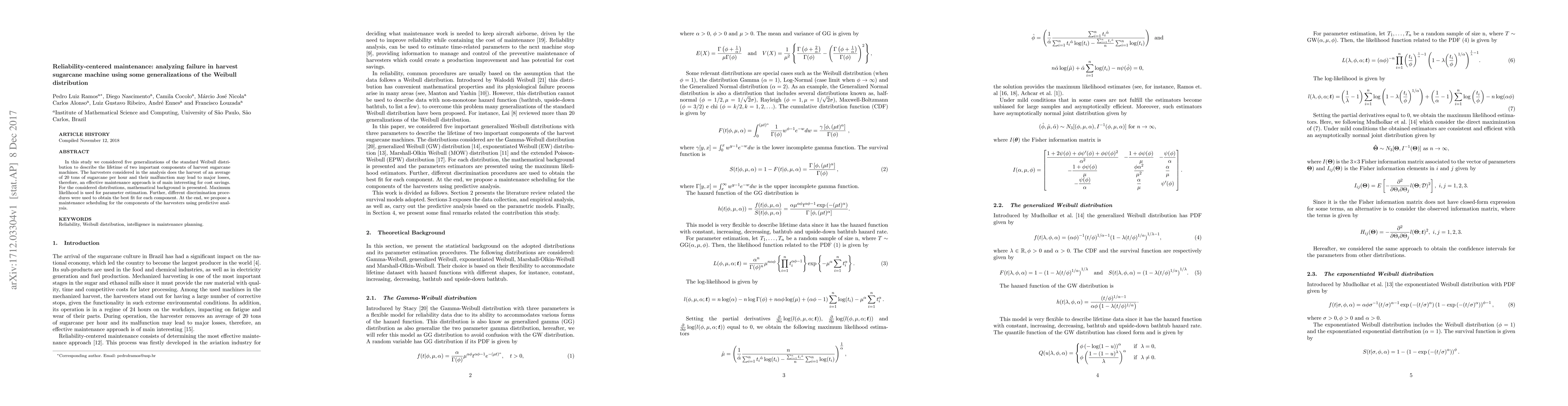 In this study we considered five generalizations of the standard Weibull distribution to describe the lifetime of two important components of harvest sugarcane machines. The harvesters considered in the analysis does the harvest of an average of 20 tons of sugarcane per hour and their malfunction may lead to major losses, therefore, an effective maintenance approach is of main interesting for cost savings. For the considered distributions, the mathematical background is presented. Maximum likelihood is used for parameter estimation. Further, different discrimination procedures were used to obtain the best fit for each component. At the end, we propose a maintenance scheduling for the components of the harvesters using predictive analysis.