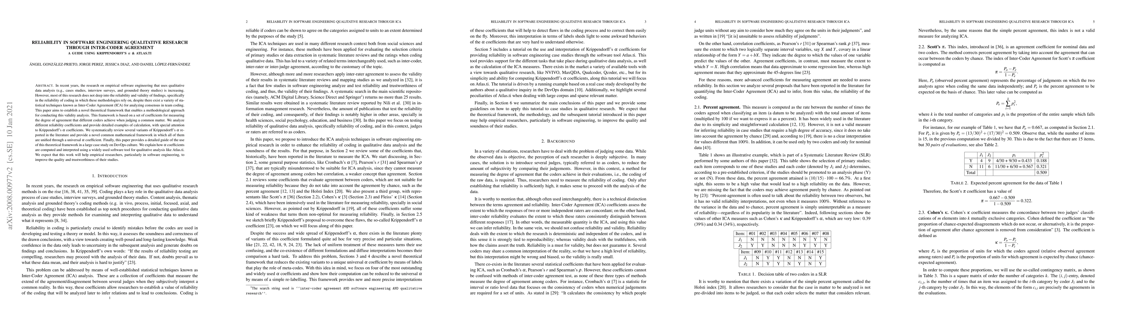 This paper proposes a methodological framework for assessing the reliability of coding in qualitative software engineering research, focusing on Inter-Coder Agreement (ICA) and Krippendorff's $\alpha$ coefficient. It provides a unified mathematical framework for various $\alpha$ variants and demonstrates their application using Atlas.ti in a DevOps culture case study.