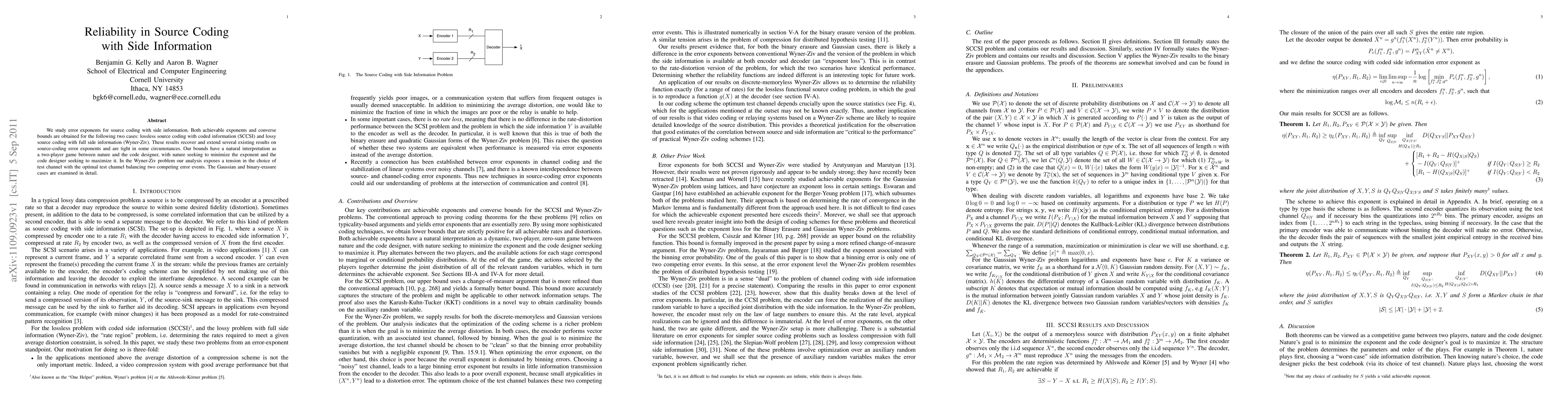 This paper investigates error exponents in source coding with side information, deriving both achievable exponents and converse bounds for lossless and lossy scenarios. The results reveal a two-player game dynamic and highlight a balance in optimal test channels, particularly in Gaussian and binary-erasure cases.