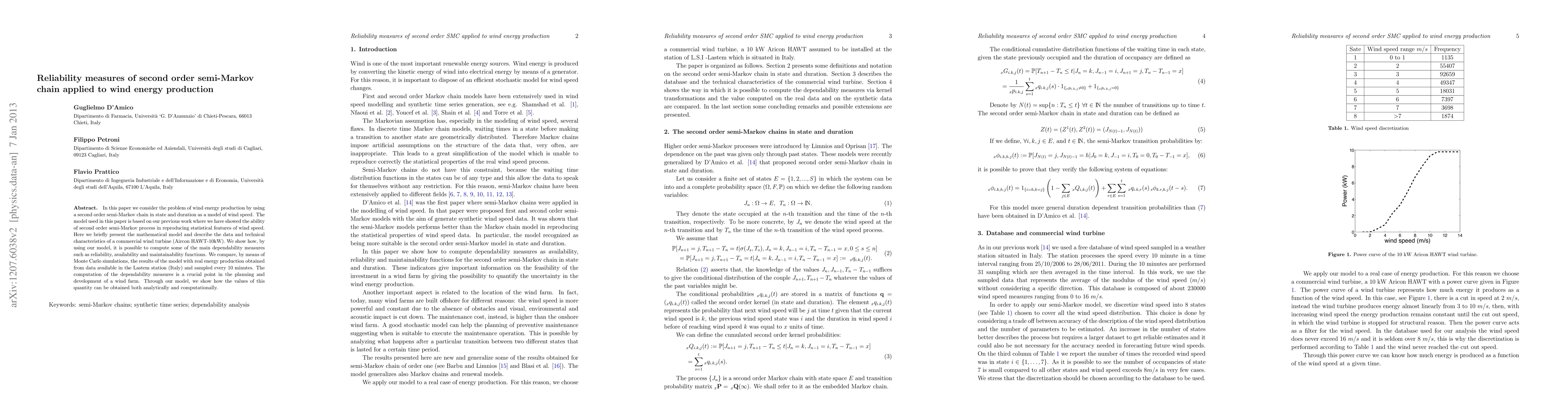 This paper applies a second order semi-Markov chain to model wind speed and compute reliability measures for wind energy production, comparing model results with real data from Lastem station. The model enables the computation of dependability measures like reliability and availability for a commercial wind turbine.