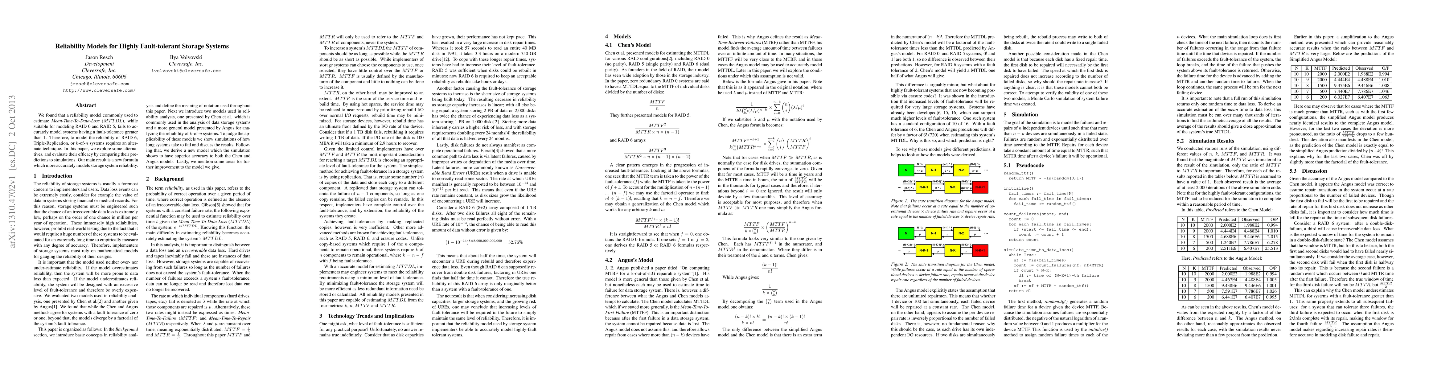 We found that a reliability model commonly used to estimate Mean-Time-To-Data-Loss (MTTDL), while suitable for modeling RAID 0 and RAID 5, fails to accurately model systems having a fault-tolerance greater than 1. Therefore, to model the reliability of RAID 6, Triple-Replication, or k-of-n systems requires an alternate technique. In this paper, we explore some alternatives, and evaluate their efficacy by comparing their predictions to simulations. Our main result is a new formula which more accurately models storage system reliability.