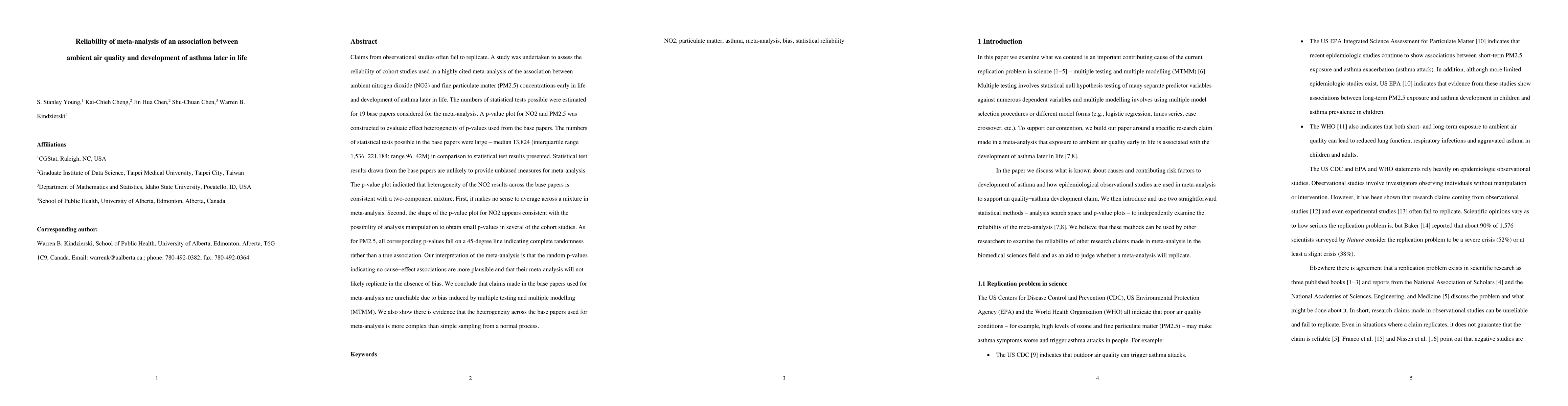 Claims from observational studies often fail to replicate. A study was undertaken to assess the reliability of cohort studies used in a highly cited meta-analysis of the association between ambient nitrogen dioxide, NO2, and fine particulate matter, PM2.5, concentrations early in life and development of asthma later in life. The numbers of statistical tests possible were estimated for 19 base papers considered for the meta-analysis. A p-value plot for NO2 and PM2.5 was constructed to evaluate effect heterogeneity of p-values used from the base papers. The numbers of statistical tests possible in the base papers were large - median 13,824, interquartile range 1,536-221,184; range 96-42M, in comparison to statistical test results presented. Statistical test results drawn from the base papers are unlikely to provide unbiased measures for meta-analysis. The p-value plot indicated that heterogeneity of the NO2 results across the base papers is consistent with a two-component mixture. First, it makes no sense to average across a mixture in meta-analysis. Second, the shape of the p-value plot for NO2 appears consistent with the possibility of analysis manipulation to obtain small p-values in several of the cohort studies. As for PM2.5, all corresponding p-values fall on a 45-degree line indicating complete randomness rather than a true association. Our interpretation of the meta-analysis is that the random p-values indicating no cause-effect associations are more plausible and that their meta-analysis will not likely replicate in the absence of bias. We conclude that claims made in the base papers used for meta-analysis are unreliable due to bias induced by multiple testing and multiple modelling, MTMM. We also show there is evidence that the heterogeneity across the base papers used for meta-analysis is more complex than simple sampling from a normal process.