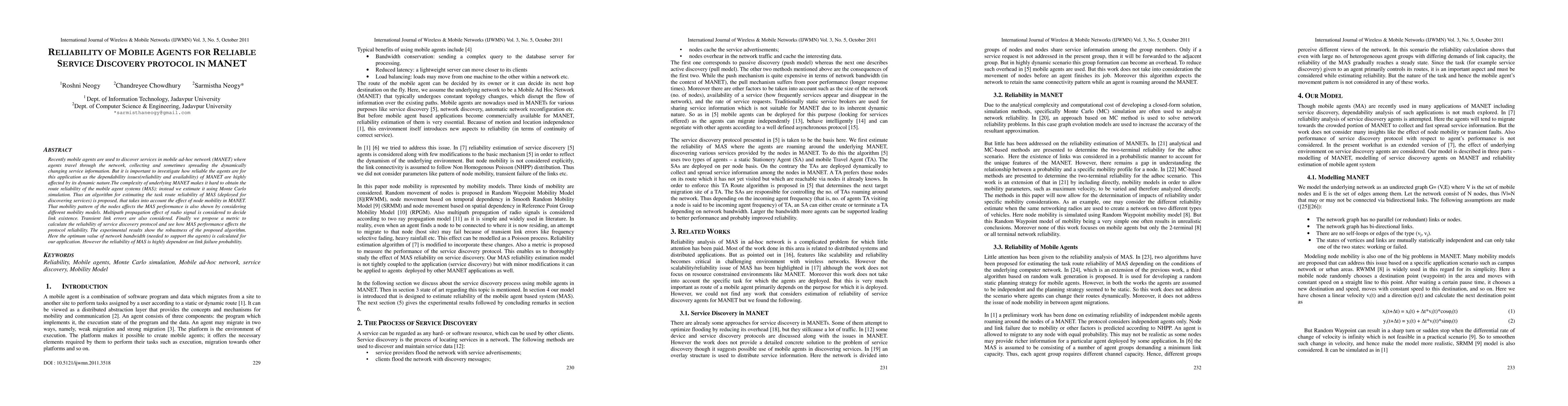 Recently mobile agents are used to discover services in mobile ad-hoc network (MANET) where agents travel through the network, collecting and sometimes spreading the dynamically changing service information. But it is important to investigate how reliable the agents are for this application as the dependability issues(reliability and availability) of MANET are highly affected by its dynamic nature.The complexity of underlying MANET makes it hard to obtain the route reliability of the mobile agent systems (MAS); instead we estimate it using Monte Carlo simulation. Thus an algorithm for estimating the task route reliability of MAS (deployed for discovering services) is proposed, that takes into account the effect of node mobility in MANET. That mobility pattern of the nodes affects the MAS performance is also shown by considering different mobility models. Multipath propagation effect of radio signal is considered to decide link existence. Transient link errors are also considered. Finally we propose a metric to calculate the reliability of service discovery protocol and see how MAS performance affects the protocol reliability. The experimental results show the robustness of the proposed algorithm. Here the optimum value of network bandwidth (needed to support the agents) is calculated for our application. However the reliability of MAS is highly dependent on link failure probability.