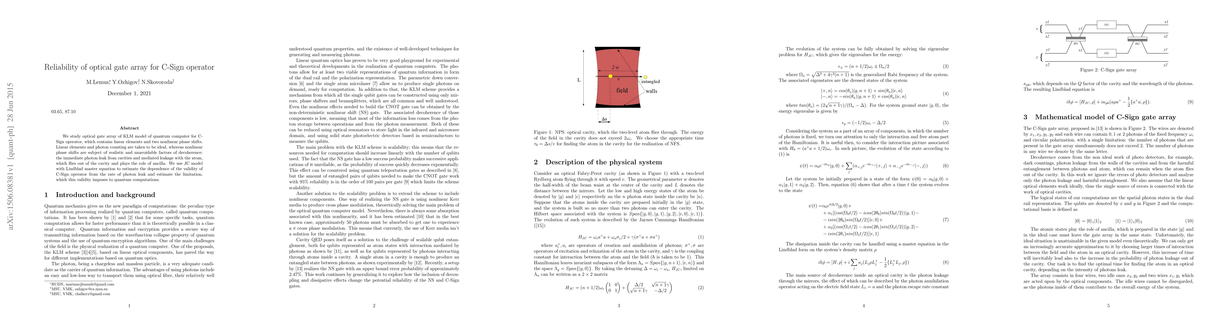 We study optical gate array of KLM model of quantum computer for C-Sign operator, which contains linear elements and two nonlinear phase shifts. Linear elements and photon counting are taken to be ideal, whereas nonlinear phase shifts are subject of realistic and unavoidable factors of decoherence: the immediate photon leak from cavities and mediated leakage with the atom, which flies out of the cavity and plays the role of ancilla. We use JC model with Lindblad master equation to estimate the dependence of the validity of C-Sign operator from the rate of photon leak and estimate the limitation, which this validity imposes to quantum computations.