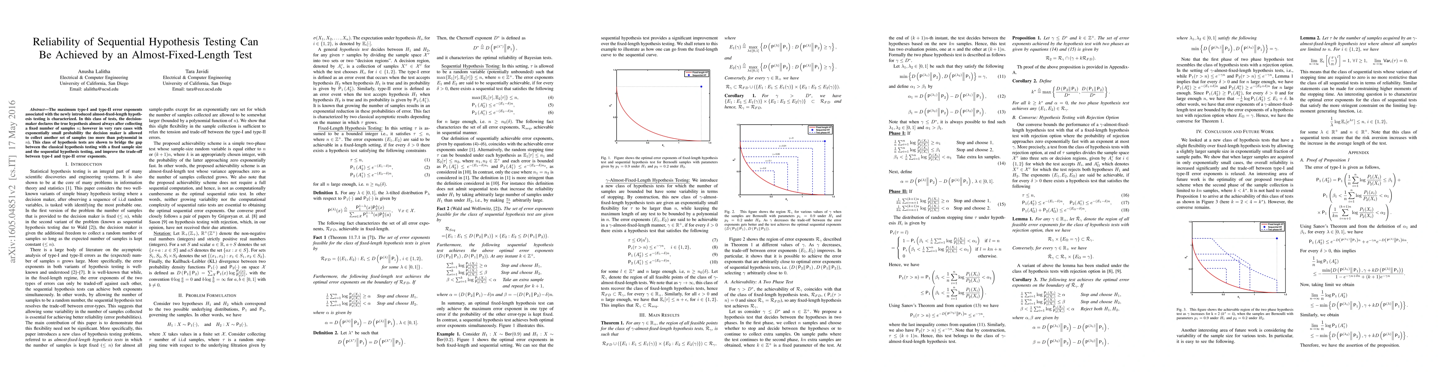 This paper introduces almost-fixed-length hypothesis testing, which achieves reliable results with a fixed sample size while allowing rare additional samples. It demonstrates that this method bridges the gap between fixed-sample and sequential testing, improving the trade-off between type-I and type-II error exponents.